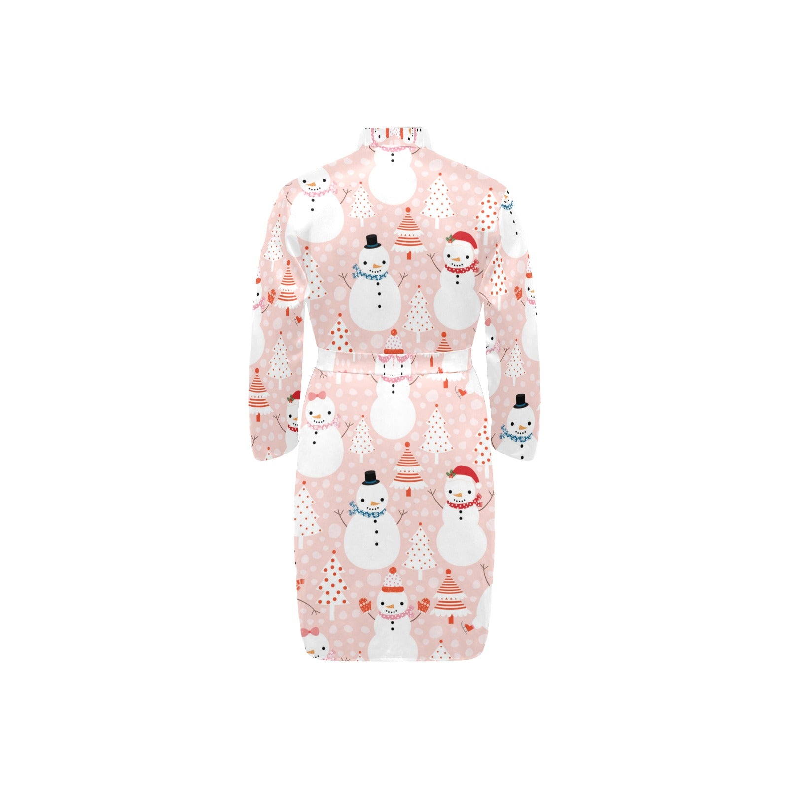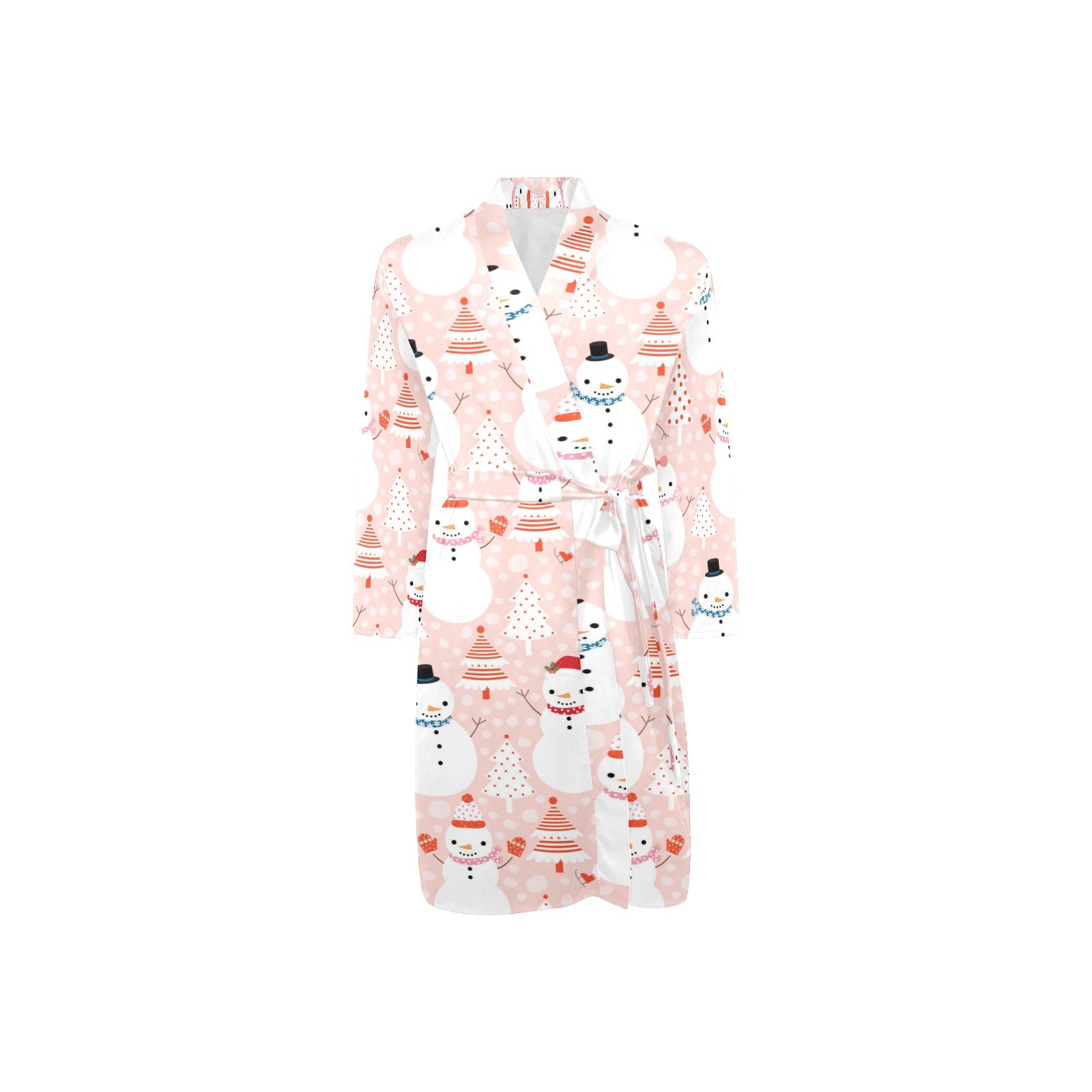Cute snowman christmas tree snowpink background Men's Long Sleeve Belted Night Robe