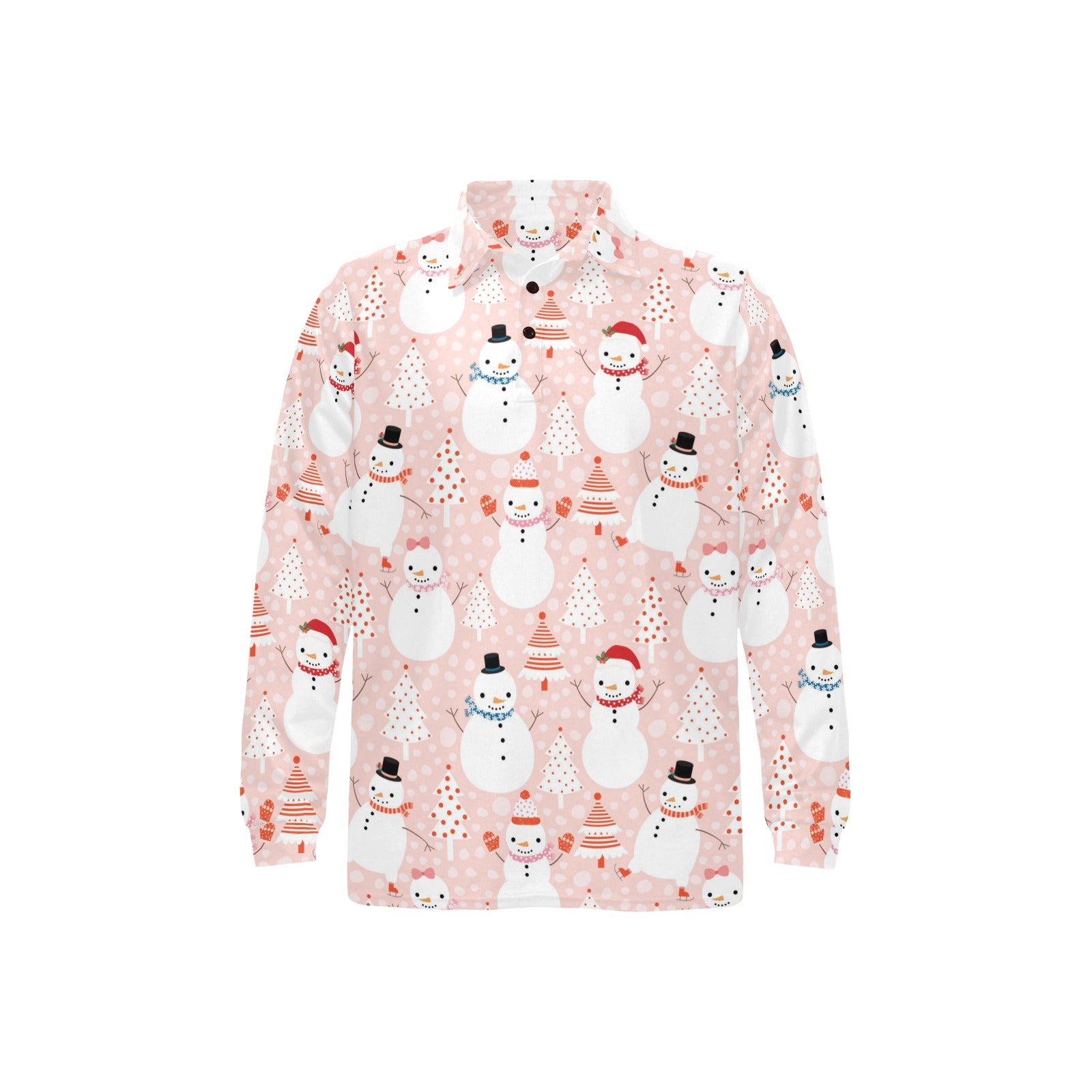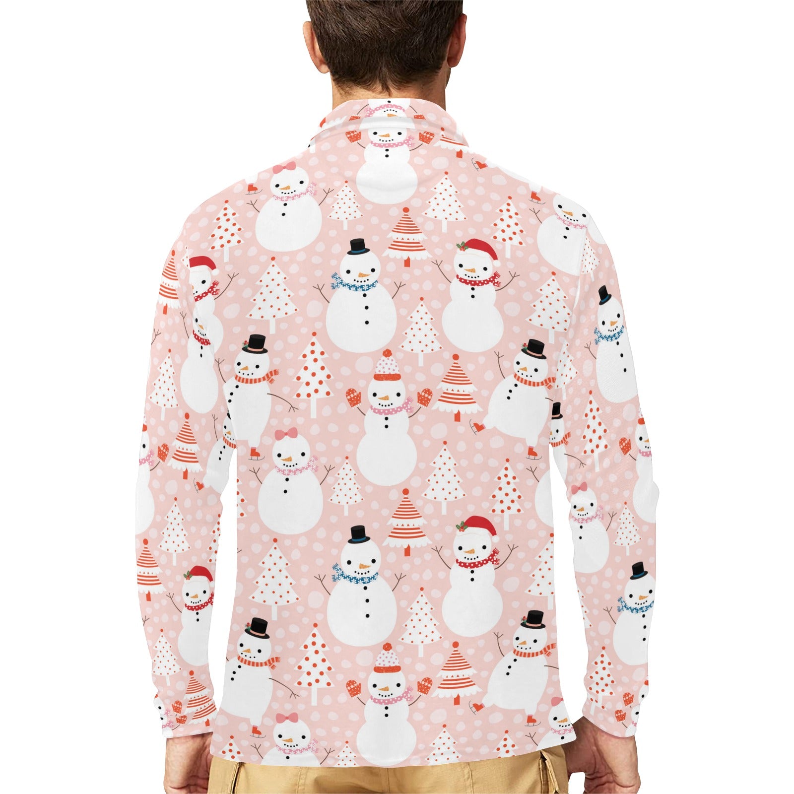 Cute snowman christmas tree snowpink background Men's Long Sleeve Polo Shirt