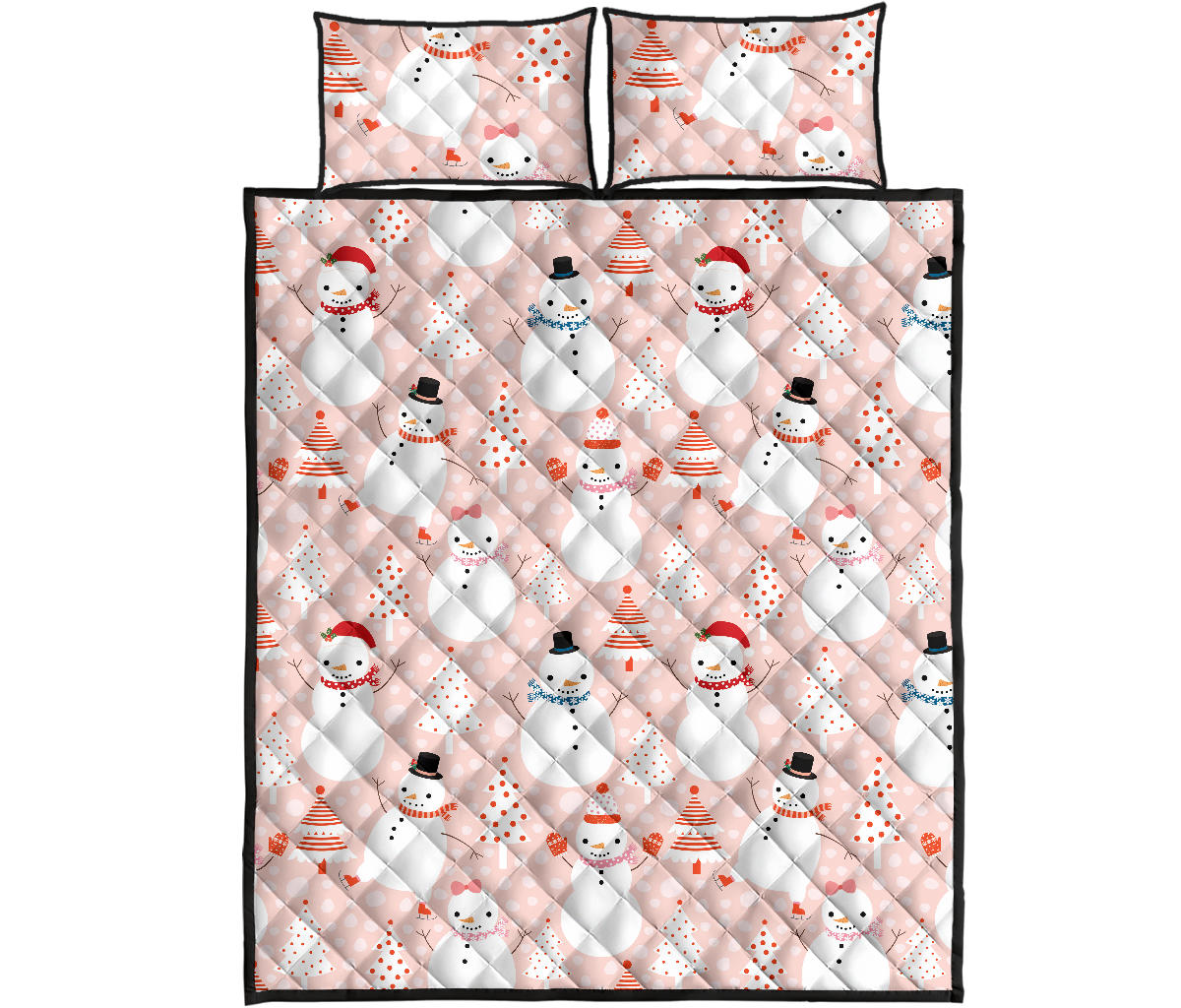 Cute snowman christmas tree snowpink background Quilt Bed Set