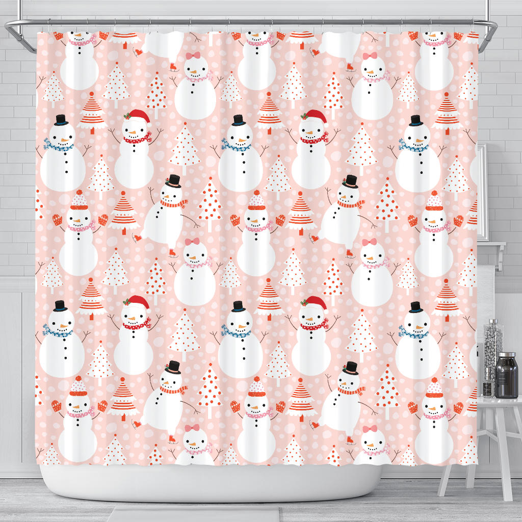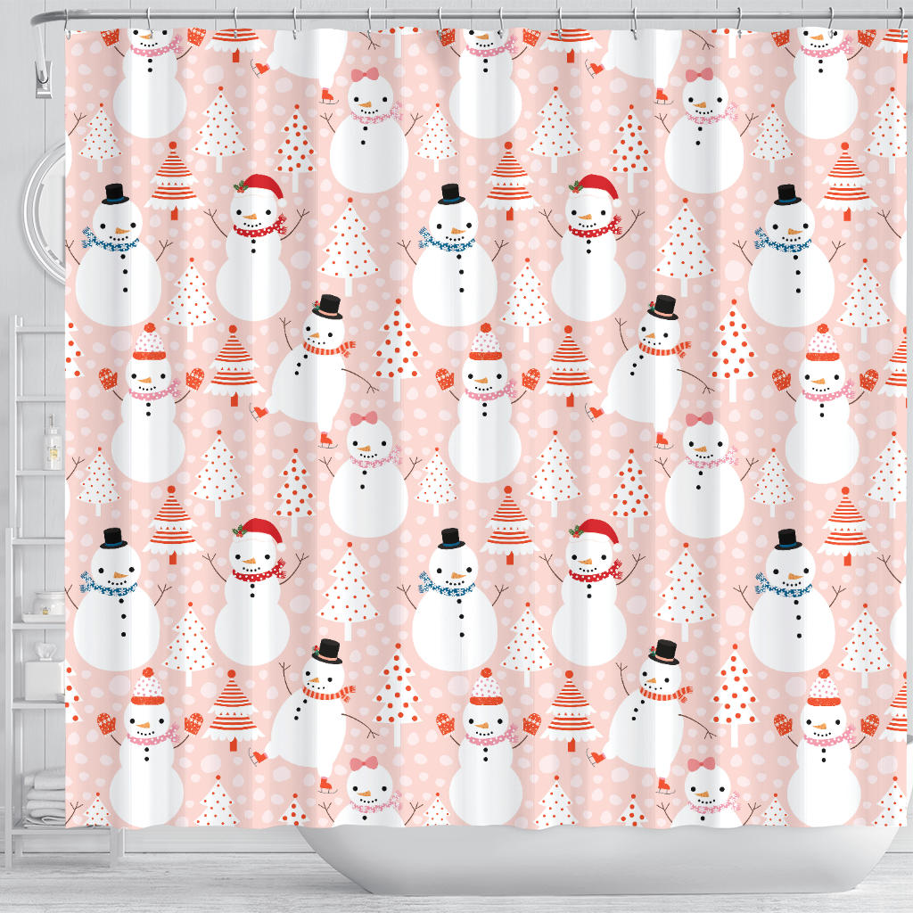 Cute snowman christmas tree snowpink background Shower Curtain is a uniqued design and limited item. It made to order, hand printed, and sewn with love in our factory.