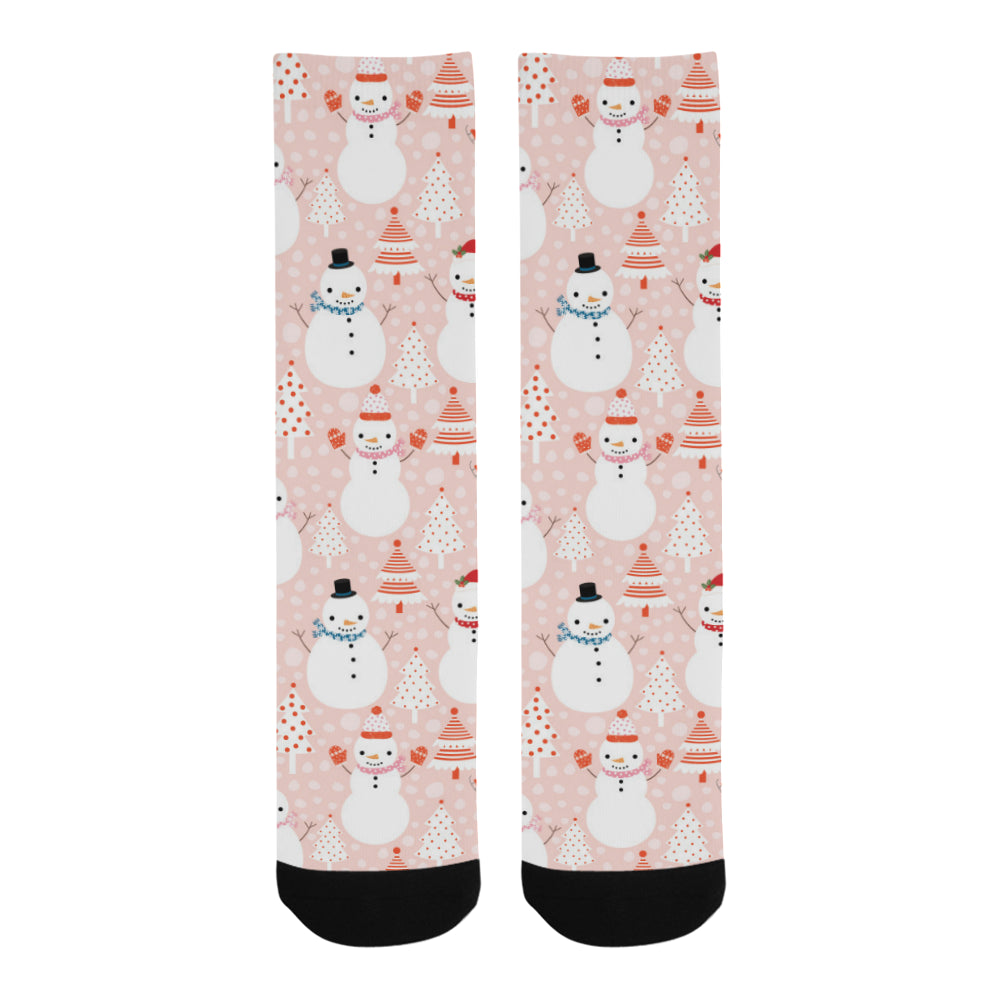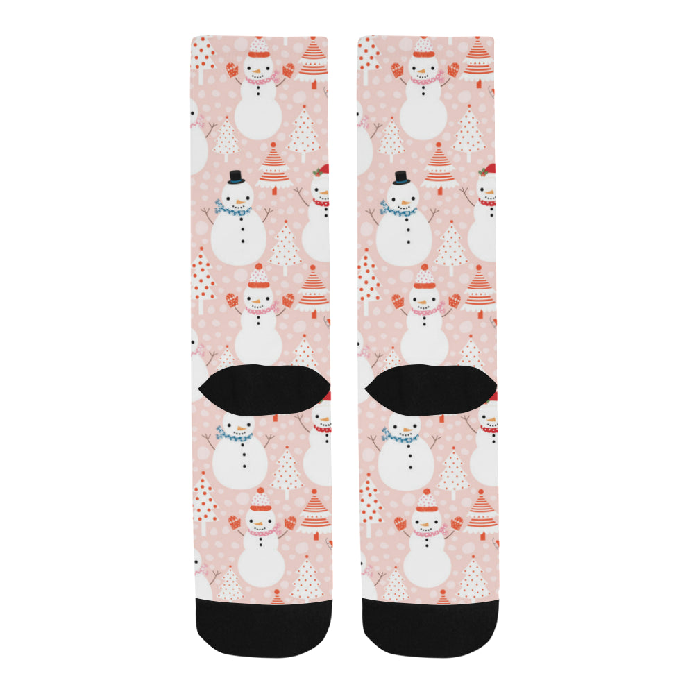 Cute snowman christmas tree snowpink background Crew Socks are uniqued design and limited item. It made to order, hand printed, and sewn with love in our factory.