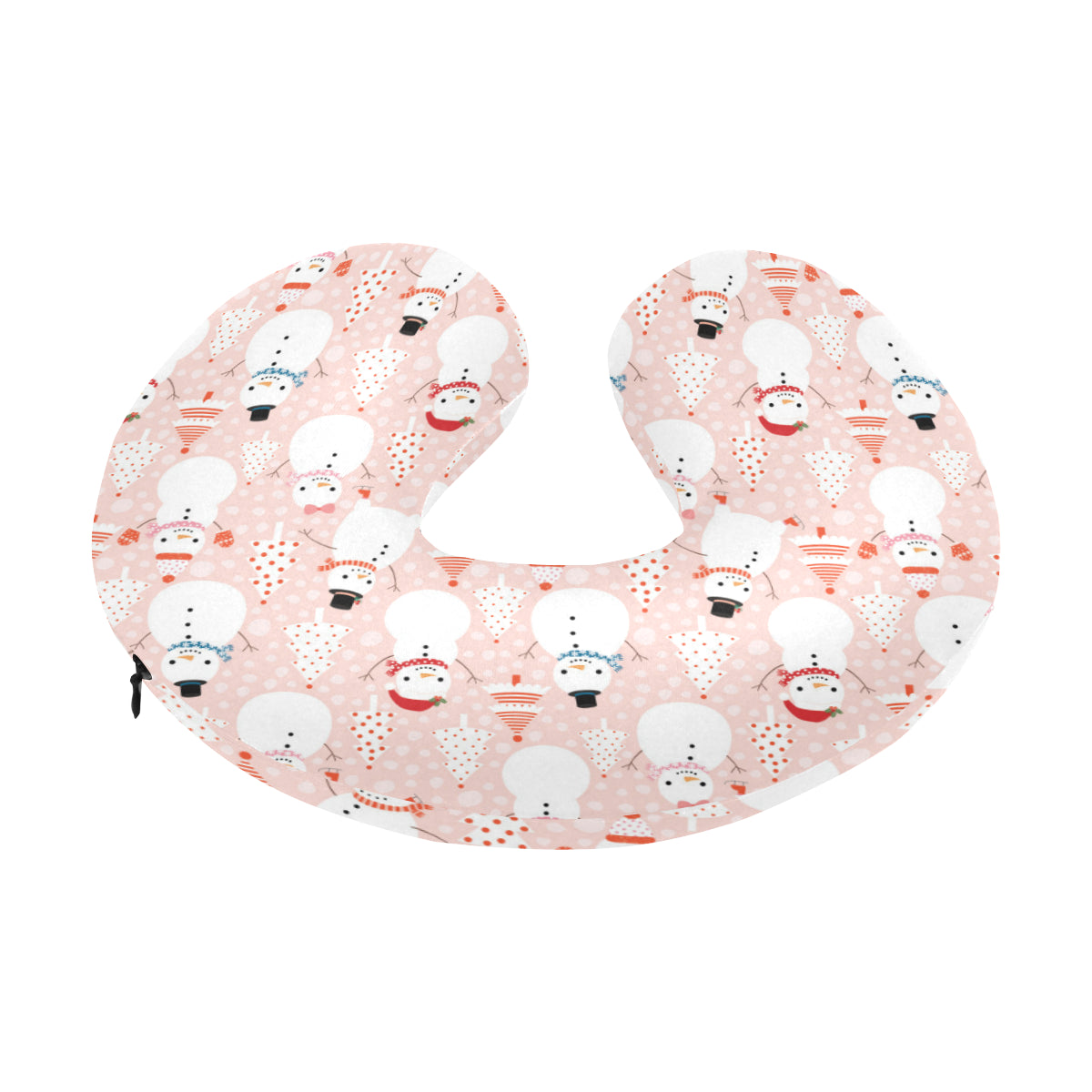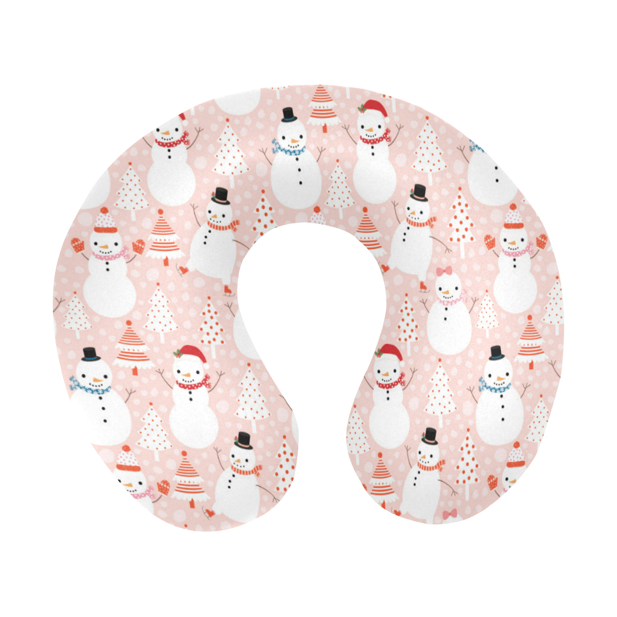 Cute snowman christmas tree snowpink background U-Shaped Travel Neck Pillow