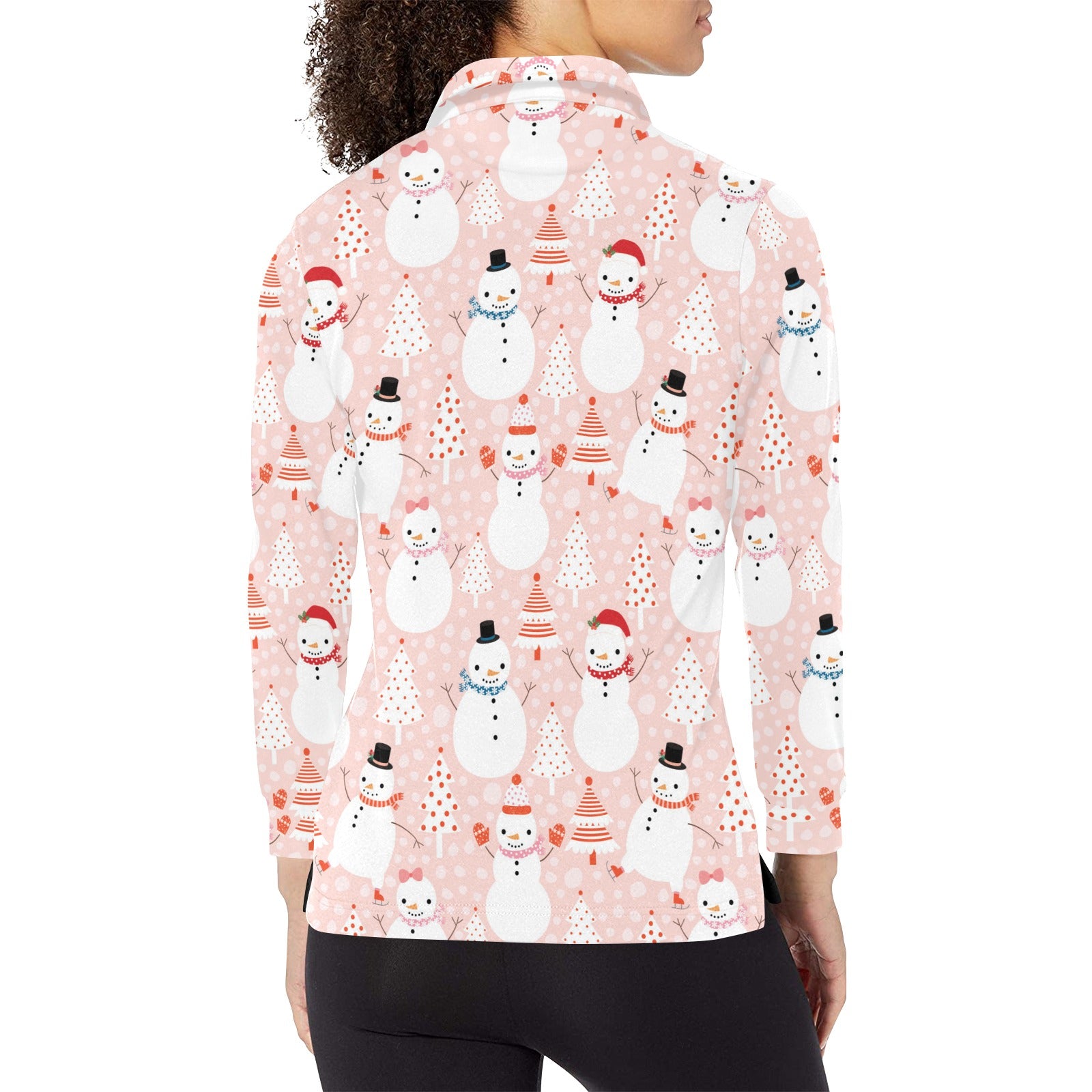 Cute snowman christmas tree snowpink background Women's Long Sleeve Polo Shirt