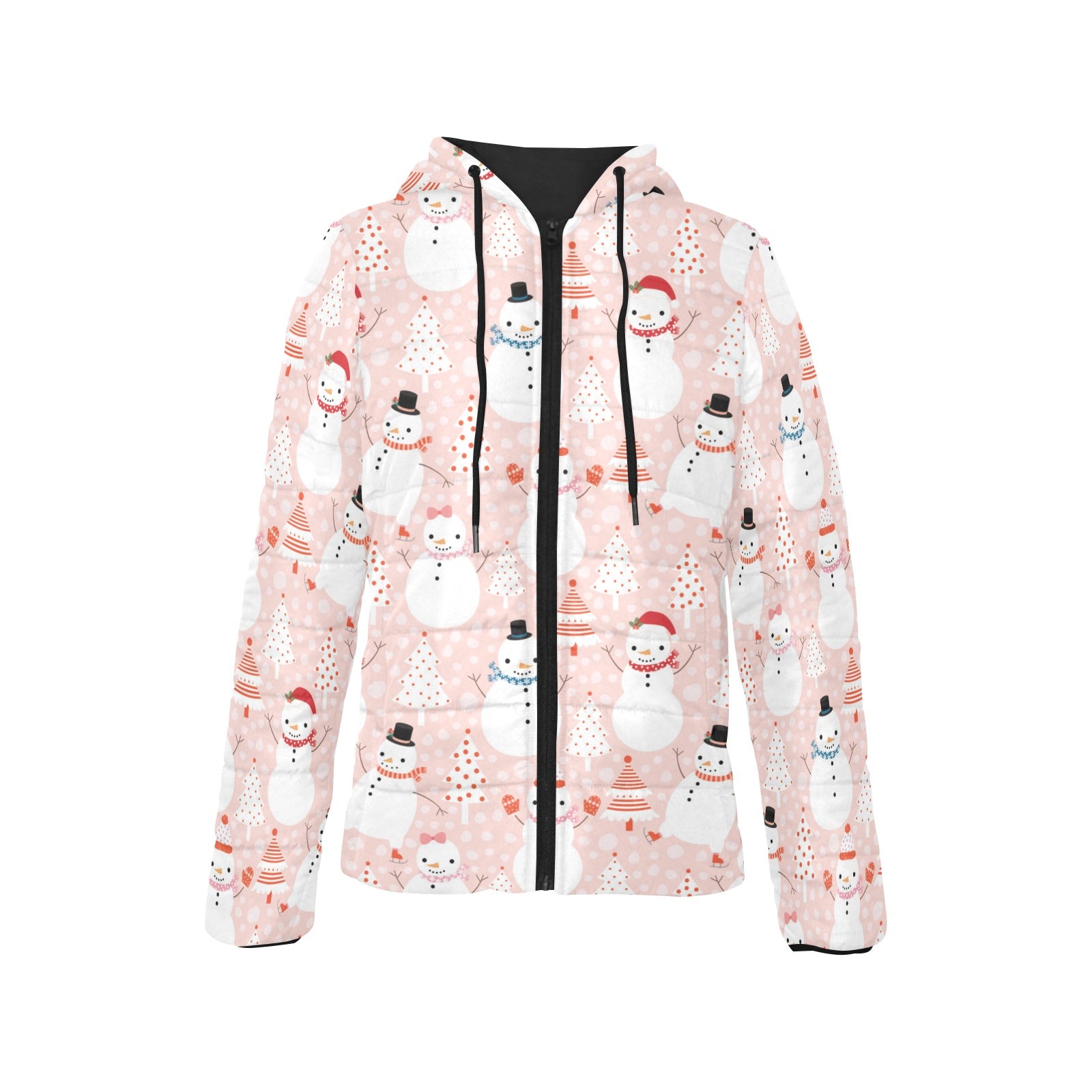 Cute snowman christmas tree snowpink background Women's Padded Hooded Jacket