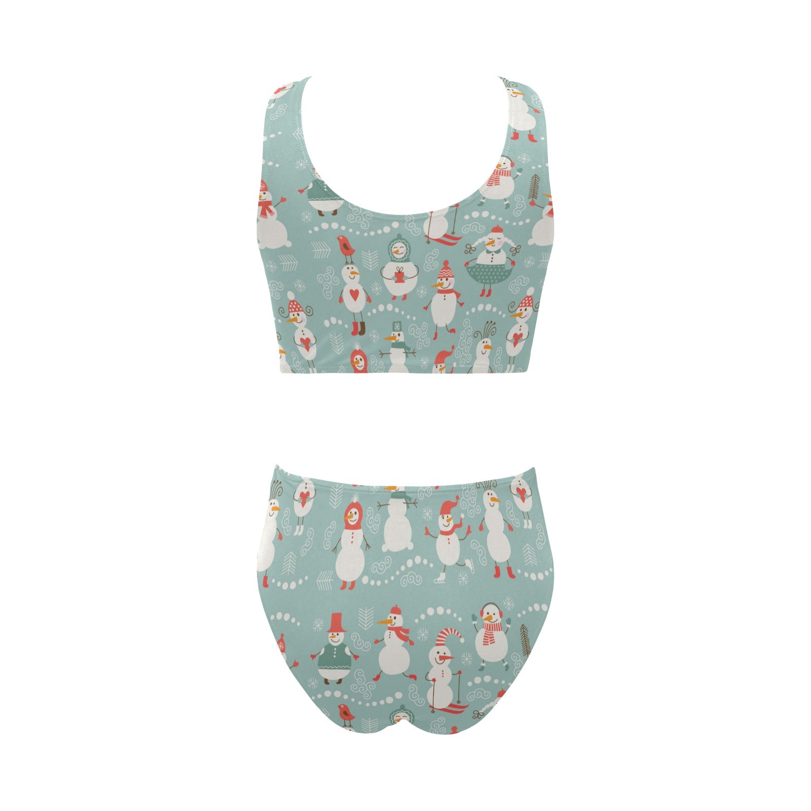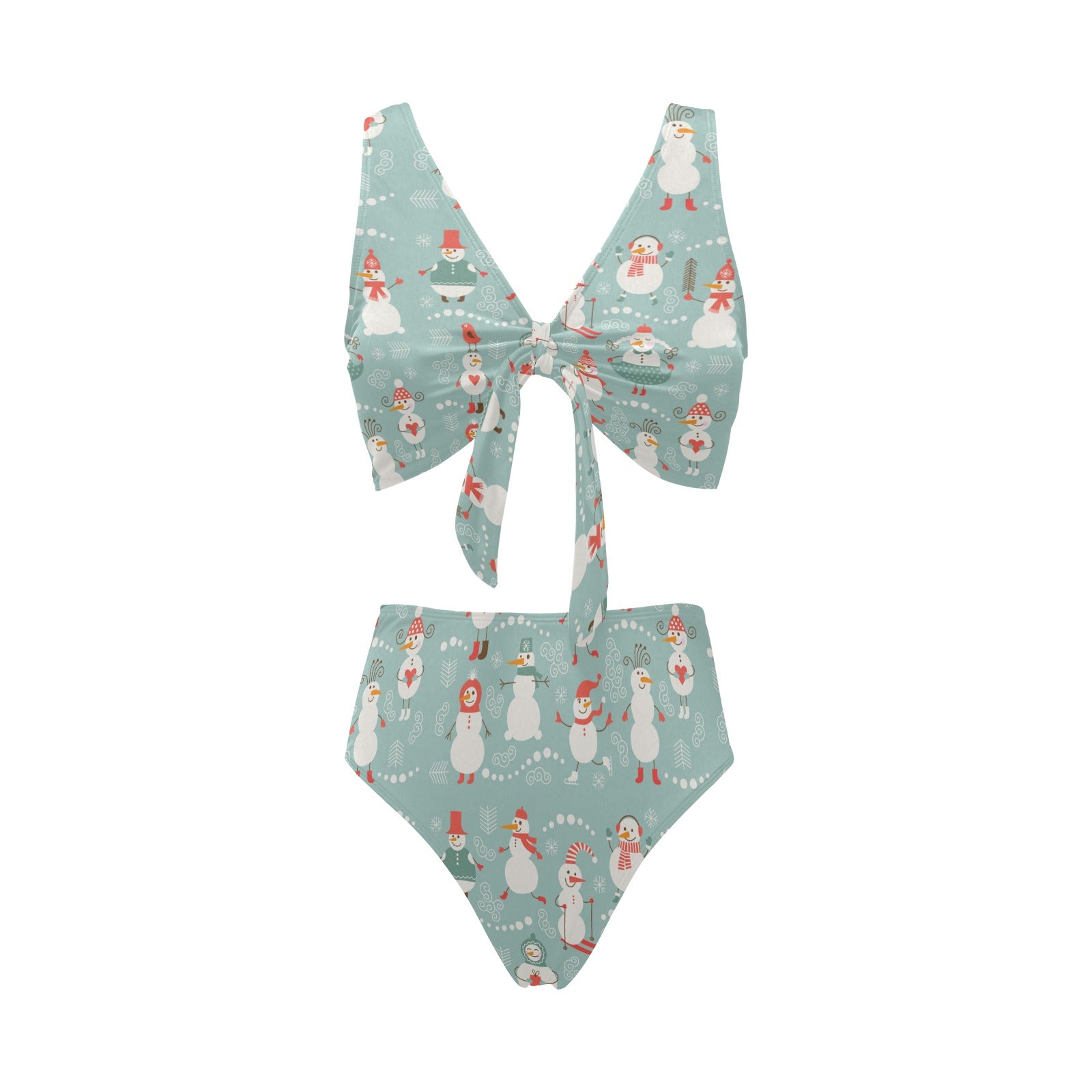 Cute snowman pattern Chest Bowknot High Waisted Bikini Swimsuit