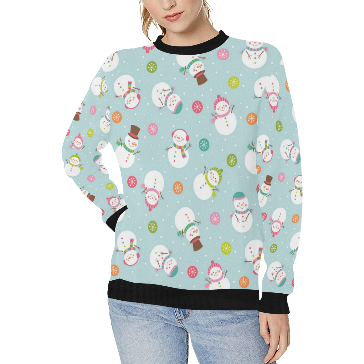 Cute snowman snowflake pattern Women's Crew Neck Sweatshirt is a uniqued design and limited item. It made to order, hand printed, and sewn with love in our factory.