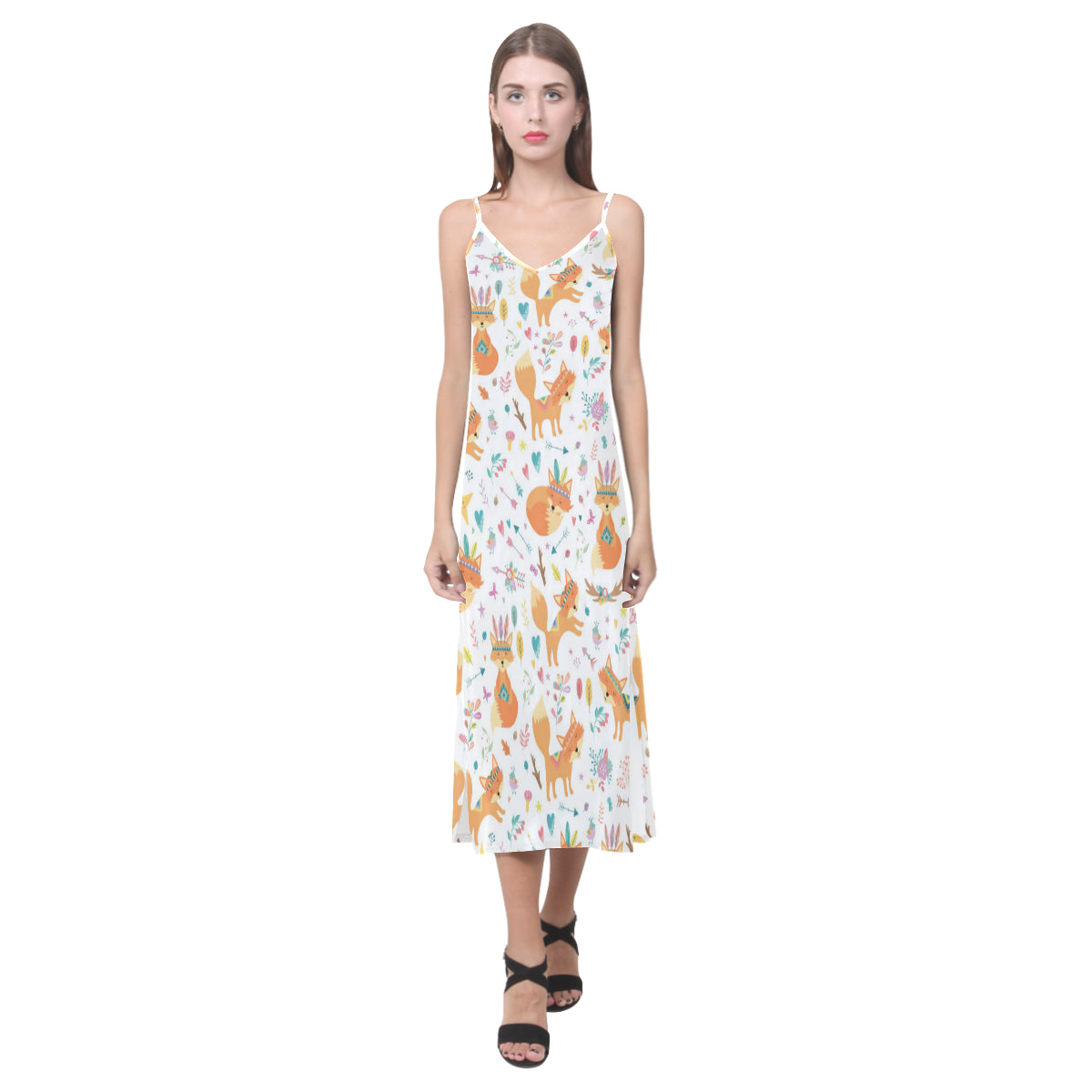 cute tribal fox pattern V-Neck Open Fork Long Dress