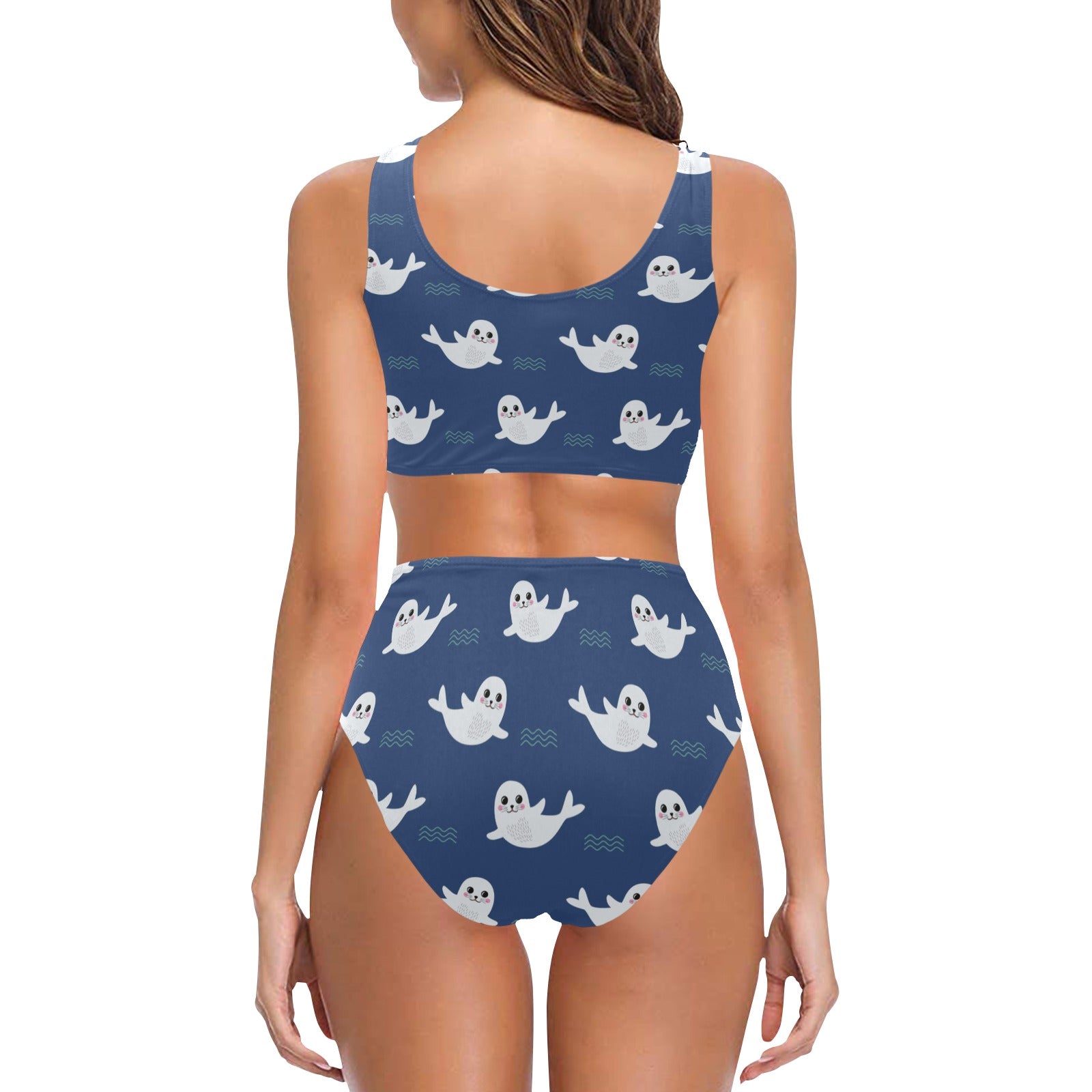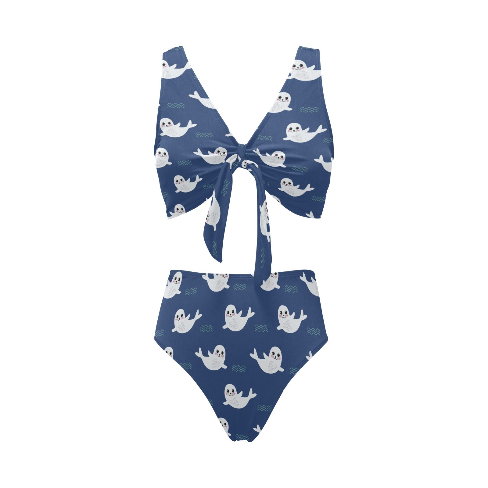 Cute white baby sea lion seal pattern Chest Bowknot High Waisted Bikini Swimsuit