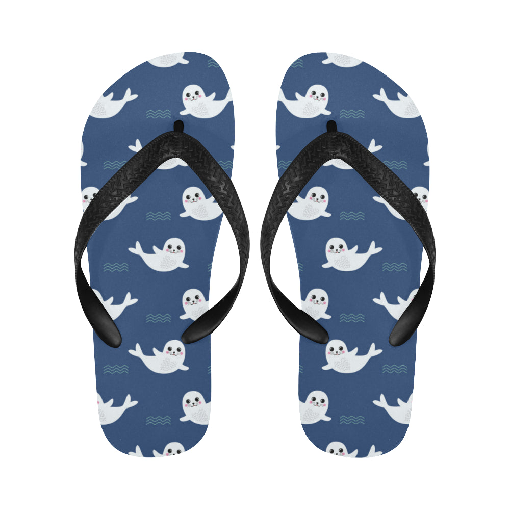 Cute white baby sea lion seal pattern Unisex Flip Flops is a uniqued design and limited item. It made to order, hand printed, and sewn with love in our factory.