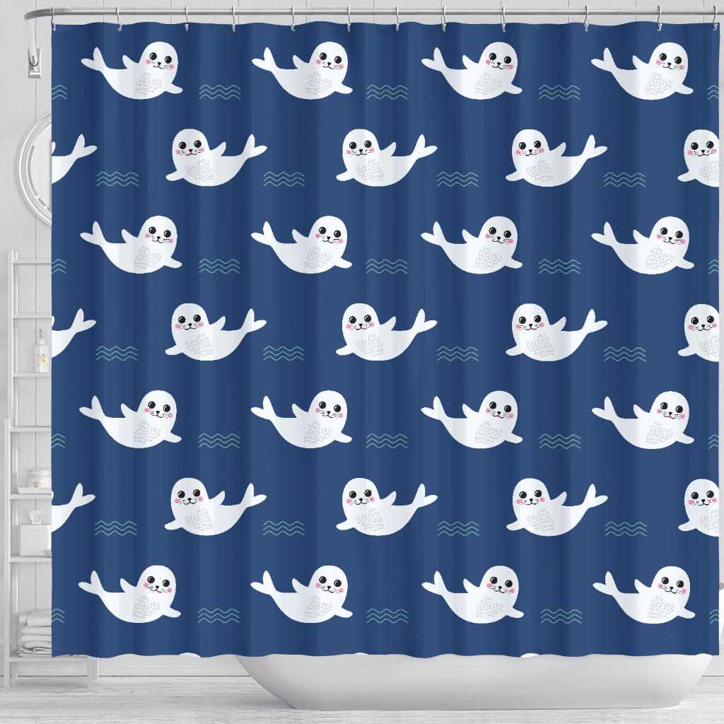 Cute white baby sea lion seal pattern Shower Curtain is a uniqued design and limited item. It made to order, hand printed, and sewn with love in our factory.