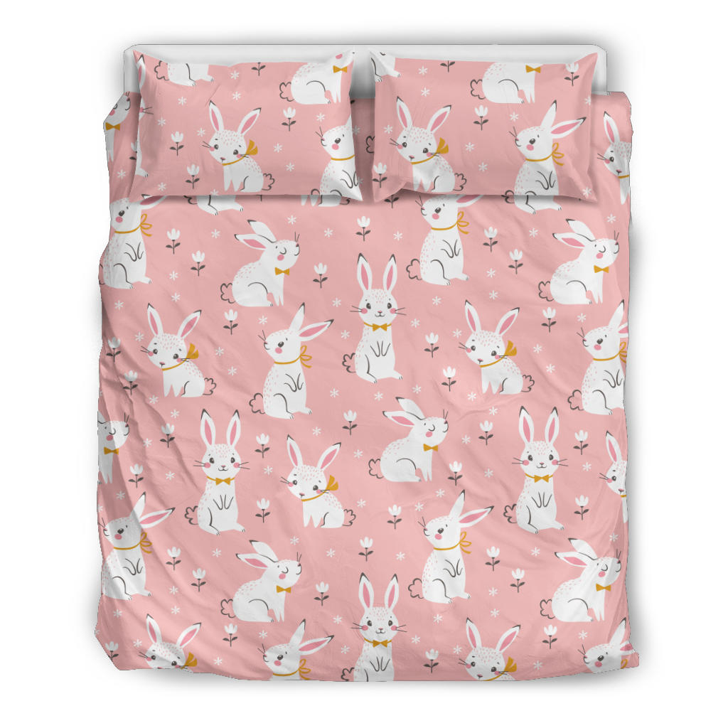 Cute white rabbit flower pink background Bedding Set is a uniqued design and limited item. It made to order, hand printed, and sewn with love in our factory.