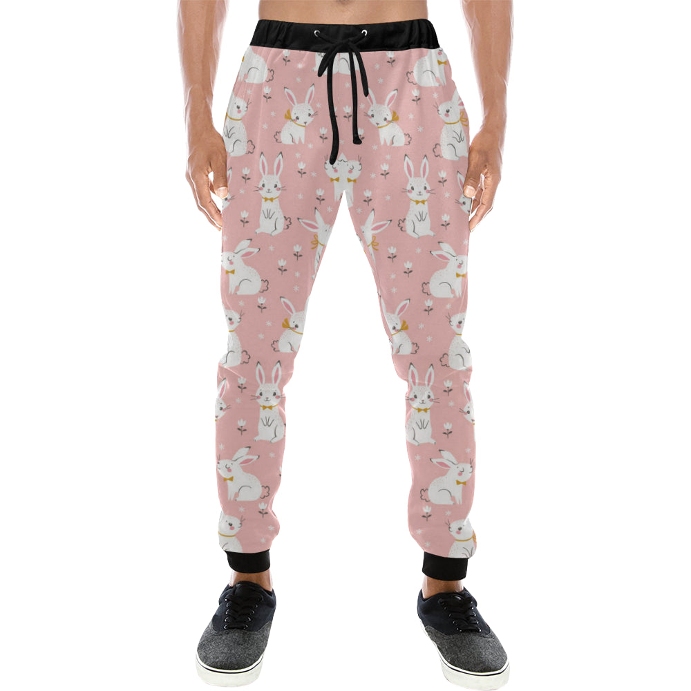 Cute white rabbit flower pink background Unisex Casual Sweatpants