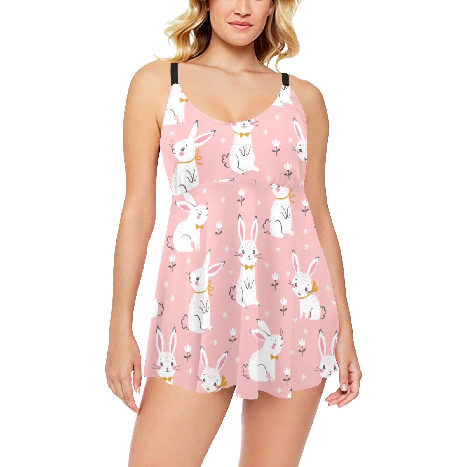 Cute white rabbit flower pink background Chest Sexy Pleated Two Piece Swim Dress