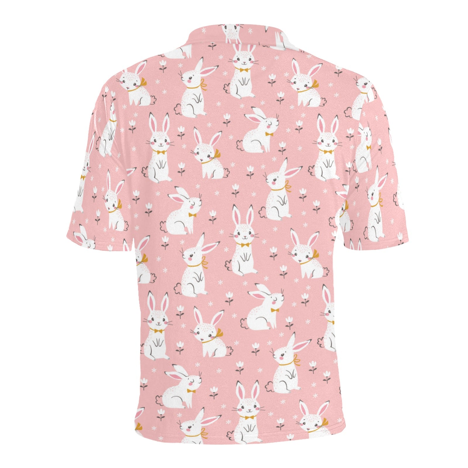 Cute white rabbit flower pink background Men's All Over Print Polo Shirt