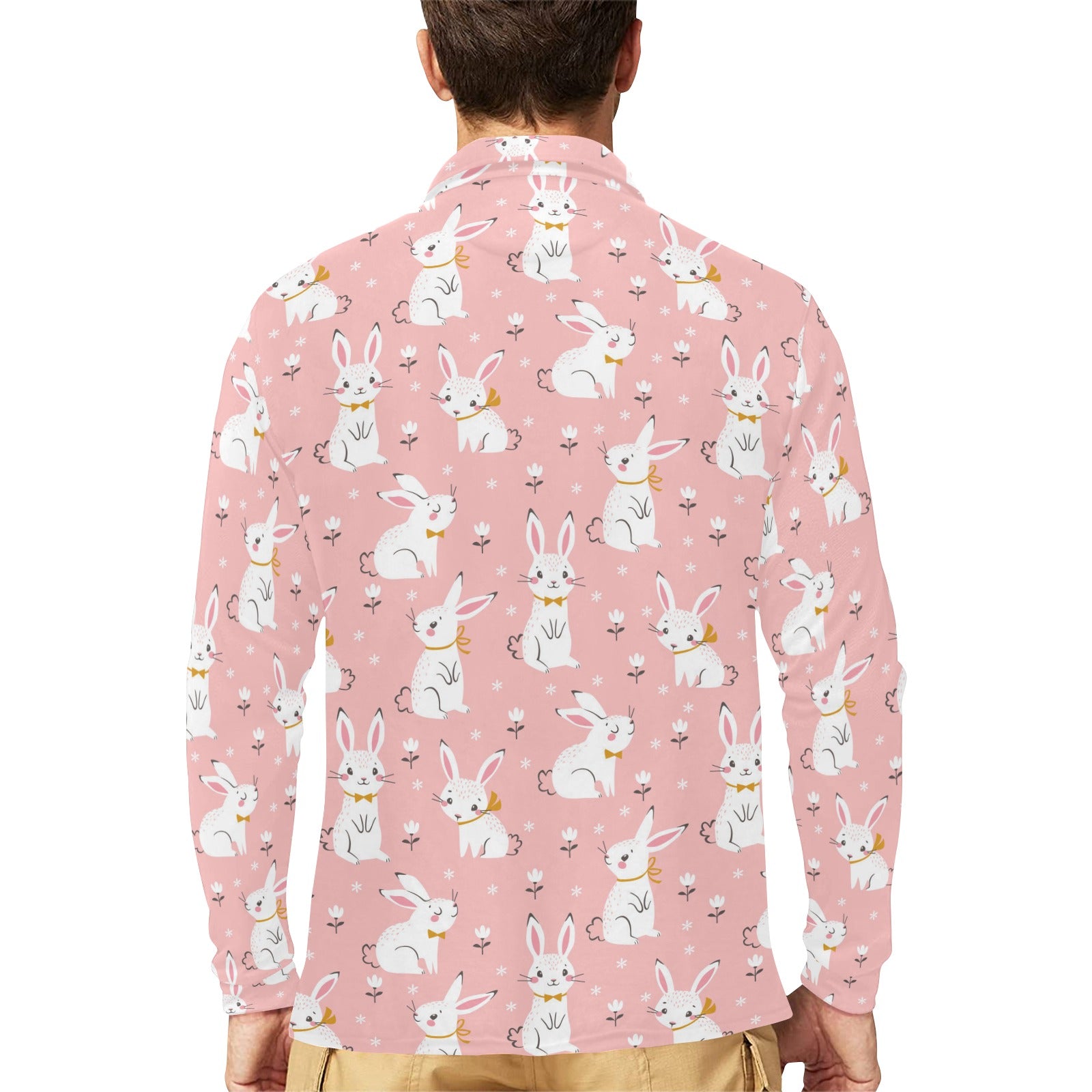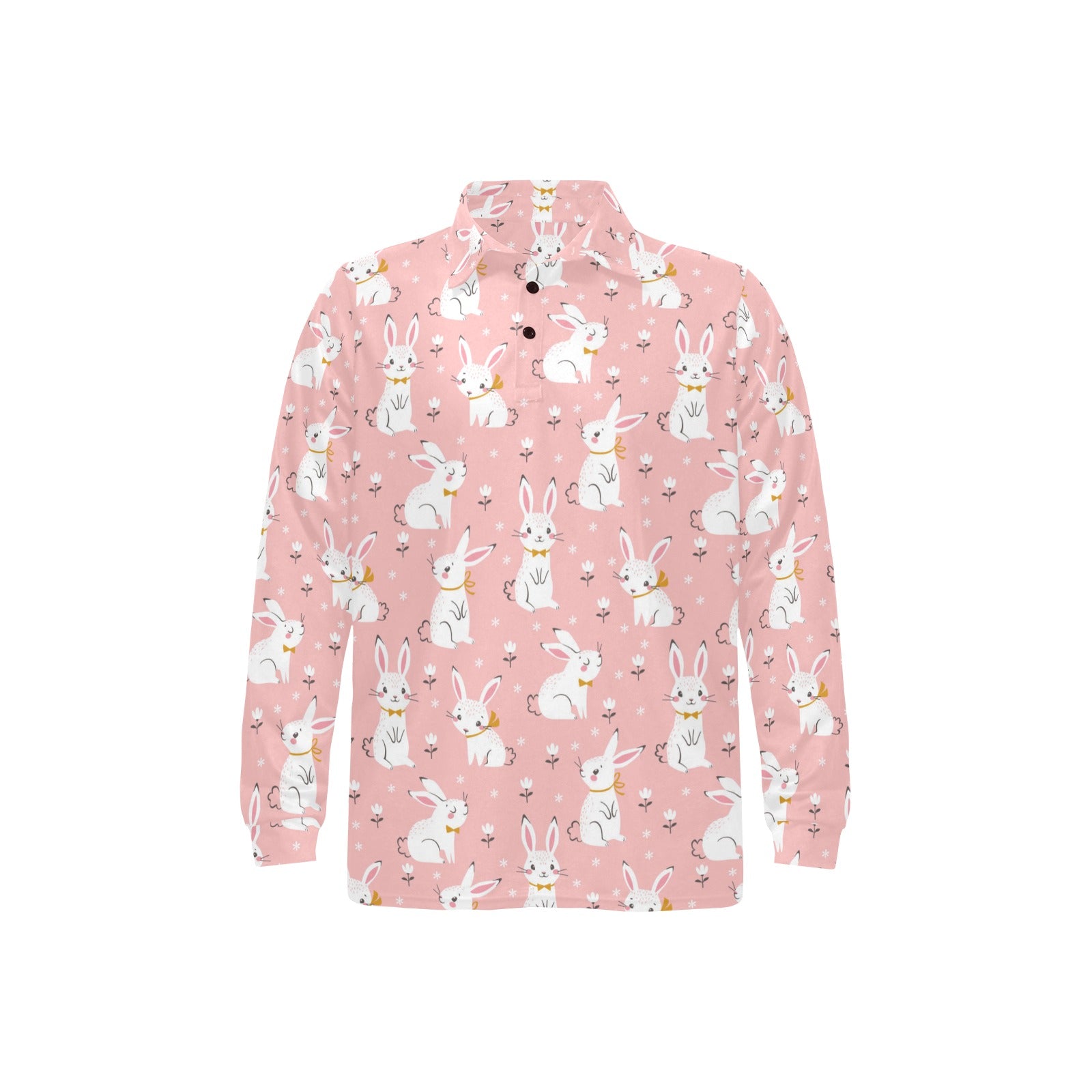 Cute white rabbit flower pink background Men's Long Sleeve Polo Shirt