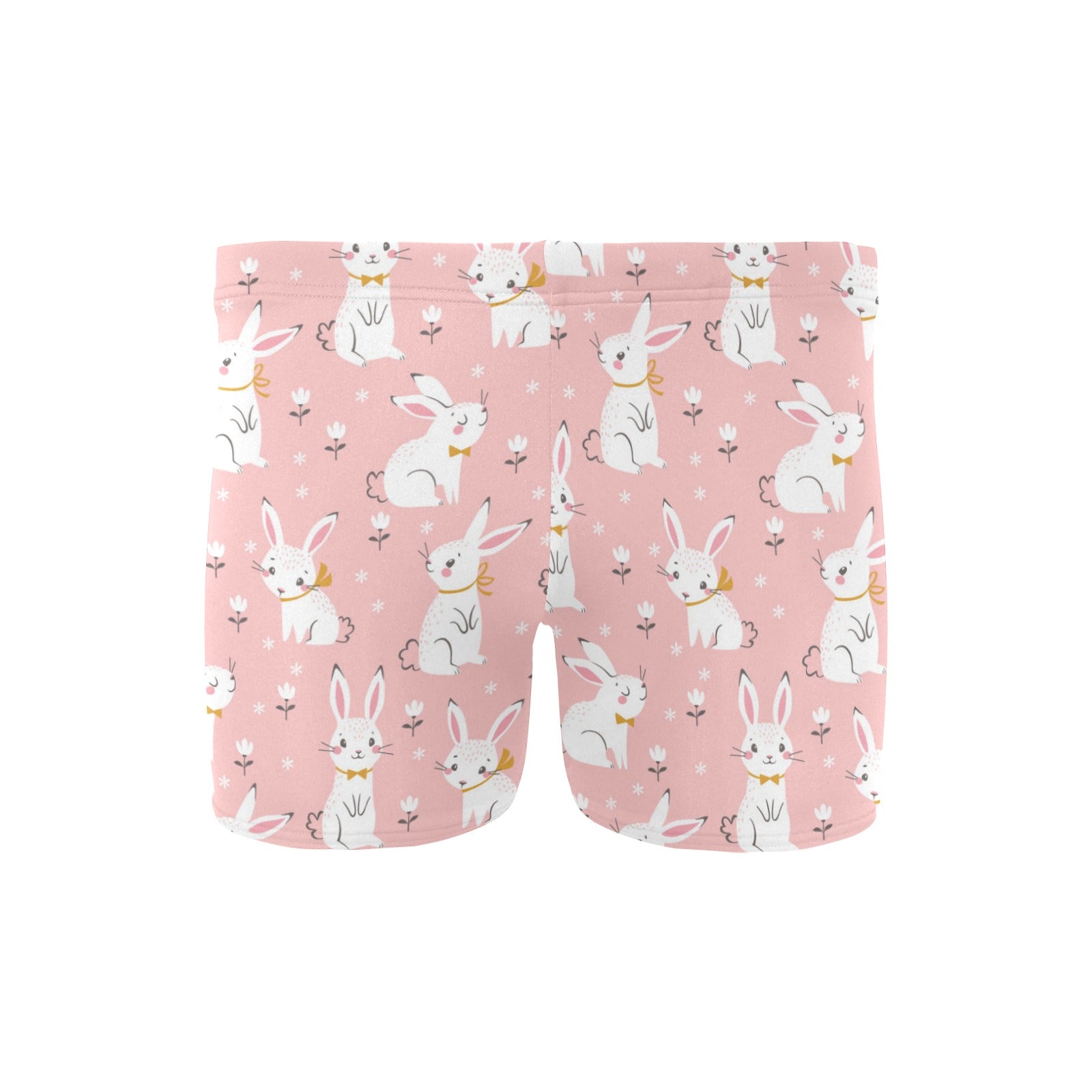 Cute white rabbit flower pink background Men's Swimming Trunks