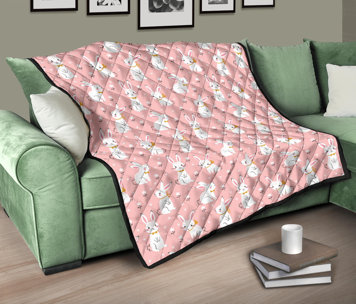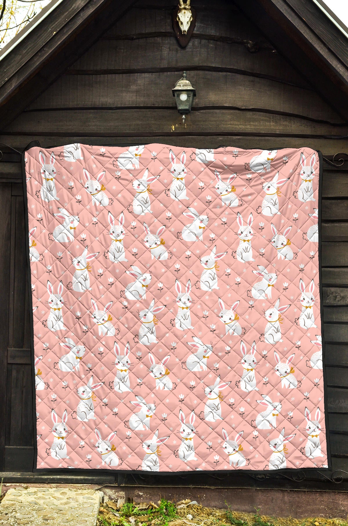Cute White Rabbit Flower Pink Background Premium Quilt. is a uniqued design and limited item. It made to order, hand printed, and sewn with love in our factory.