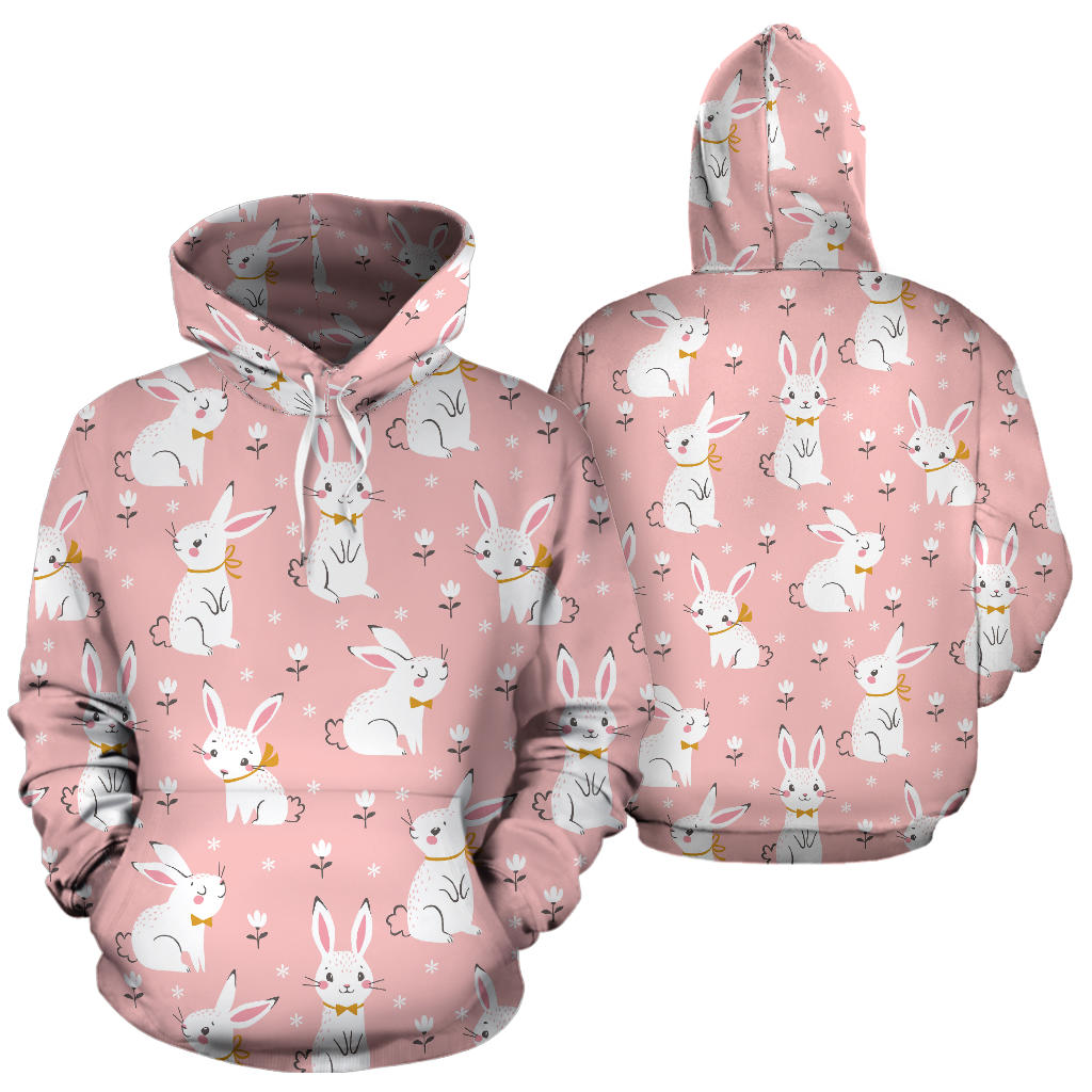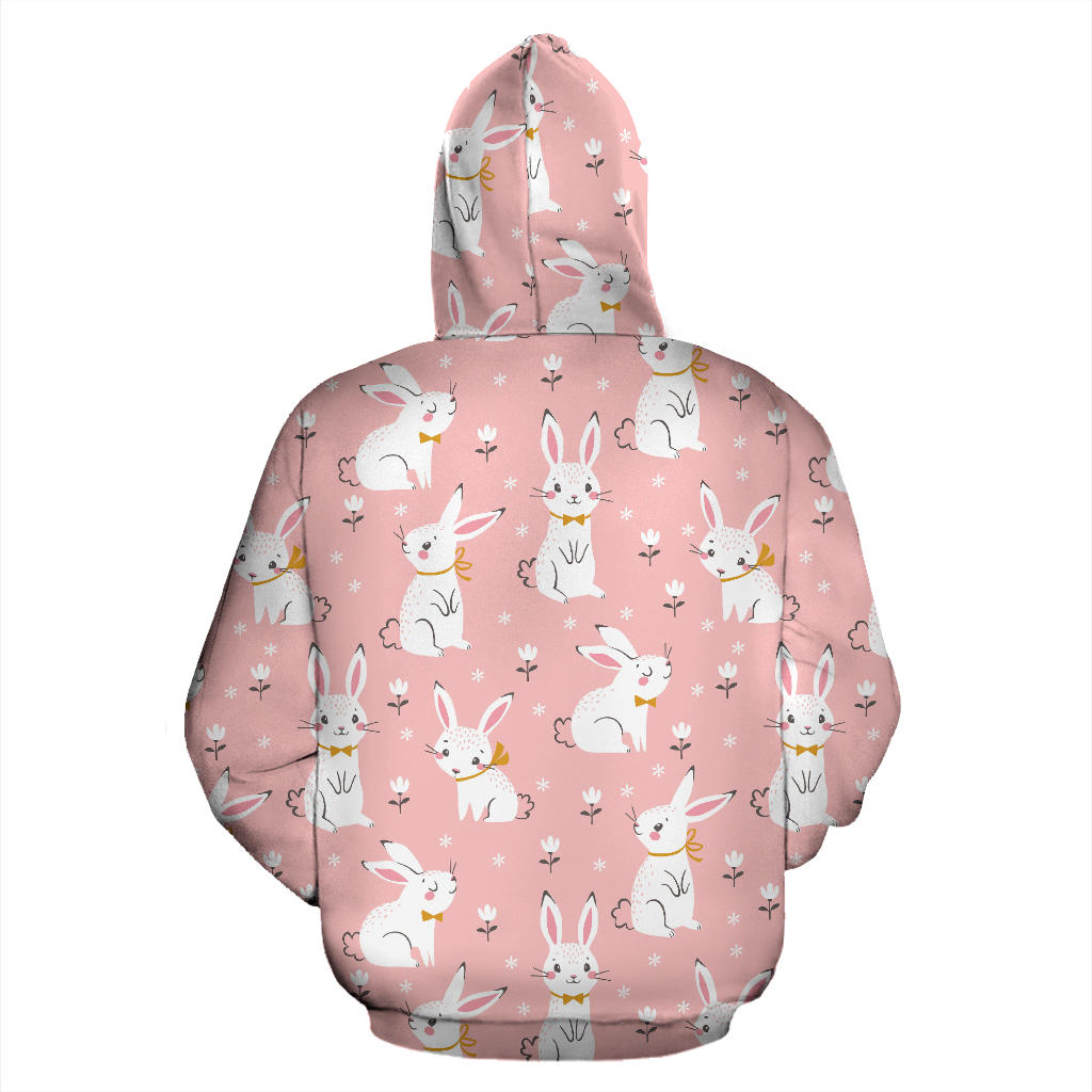 Cute White Rabbit Flower Pink Background Men Women Pullover Hoodie