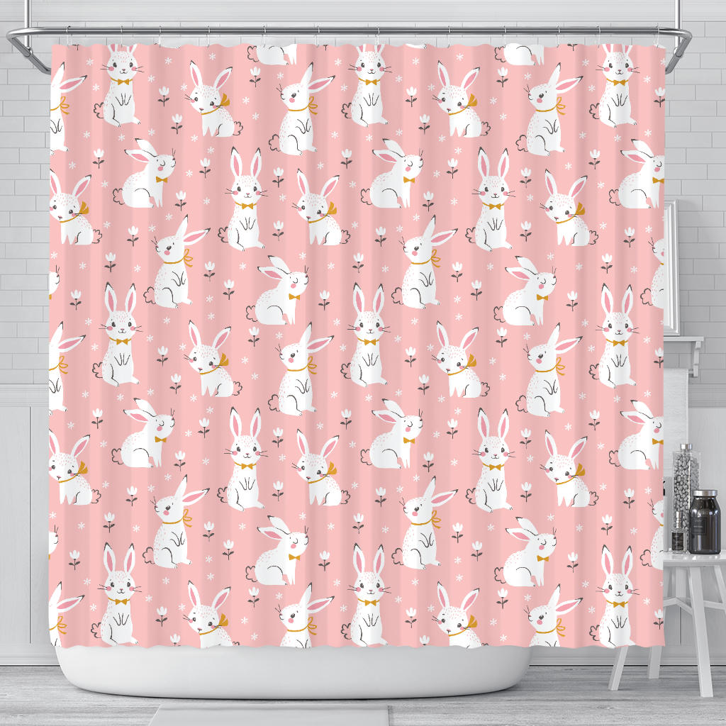 Cute White Rabbit Flower Pink Background Shower Curtain Fulfilled In US