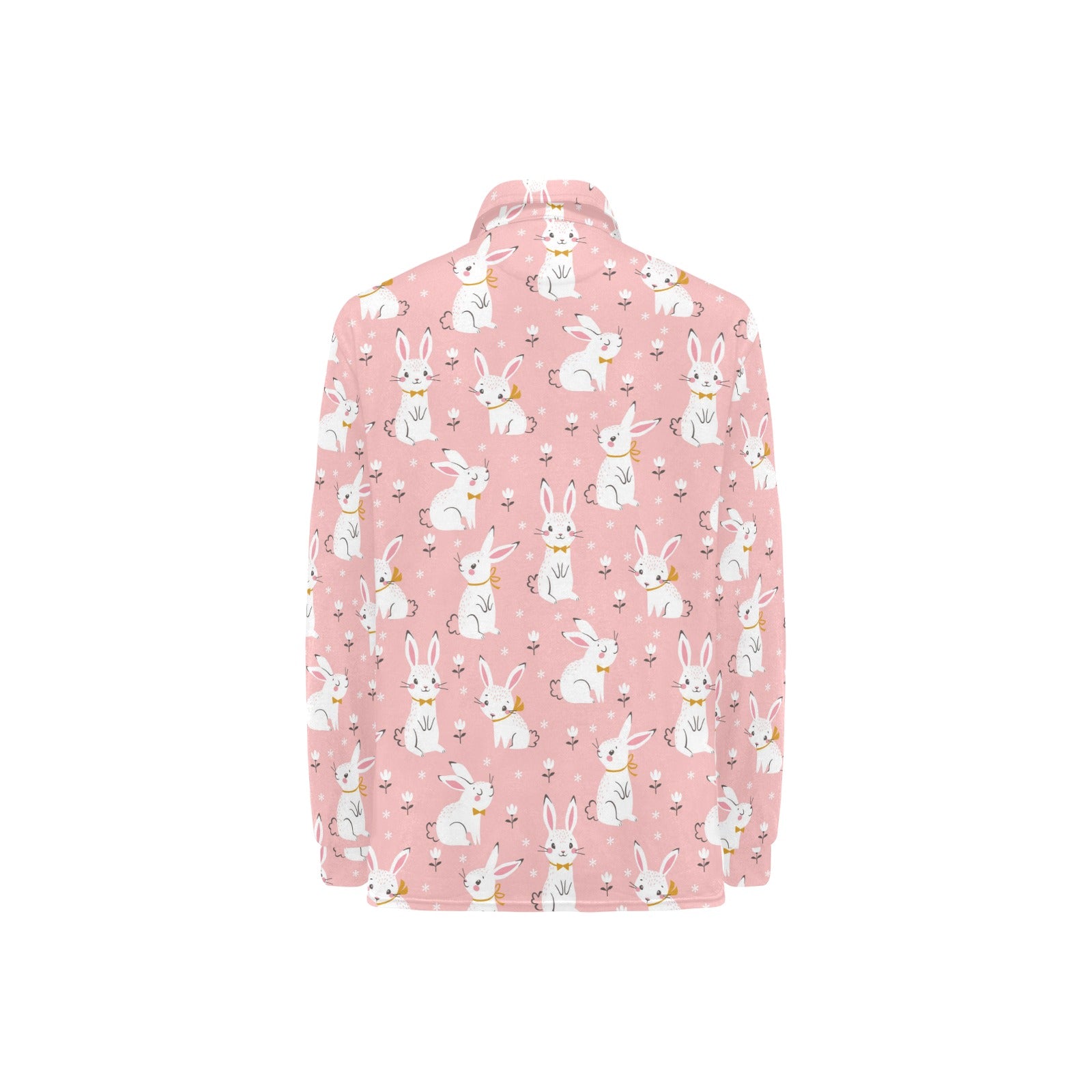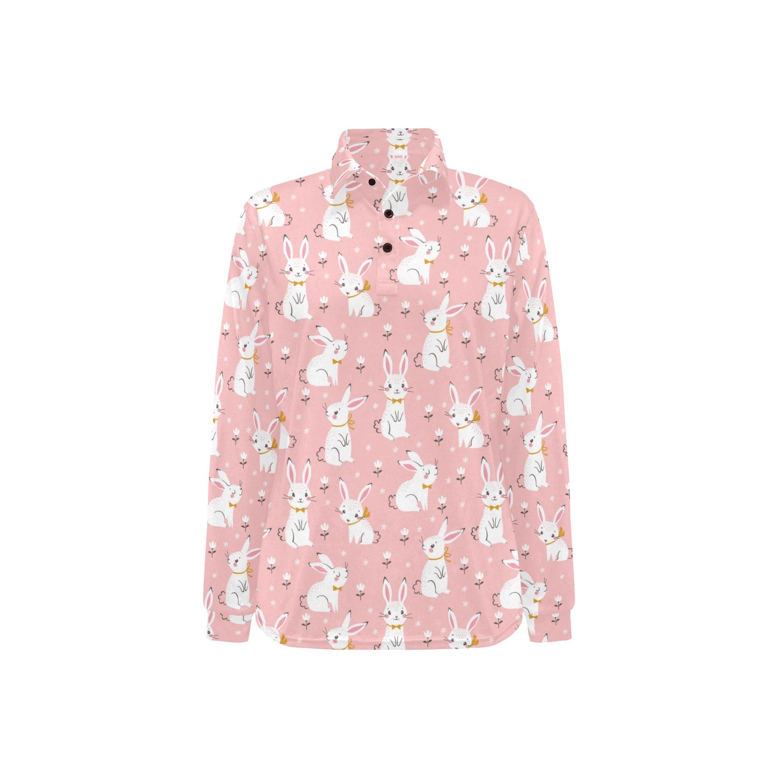 Cute white rabbit flower pink background Women's Long Sleeve Polo Shirt