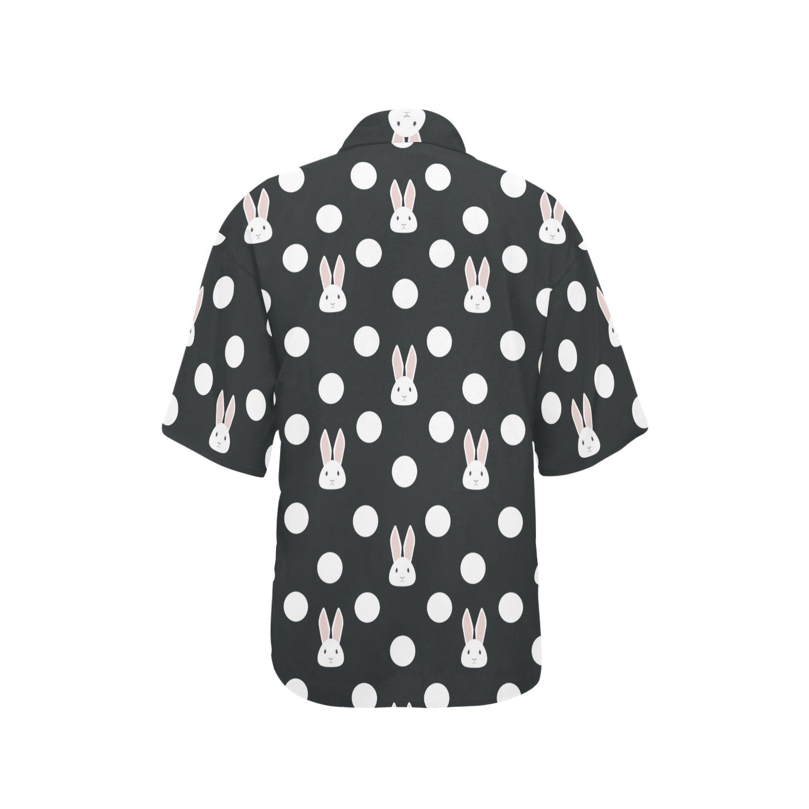 Cute white rabbit polka dots black background Women's All Over Print Hawaiian Shirt