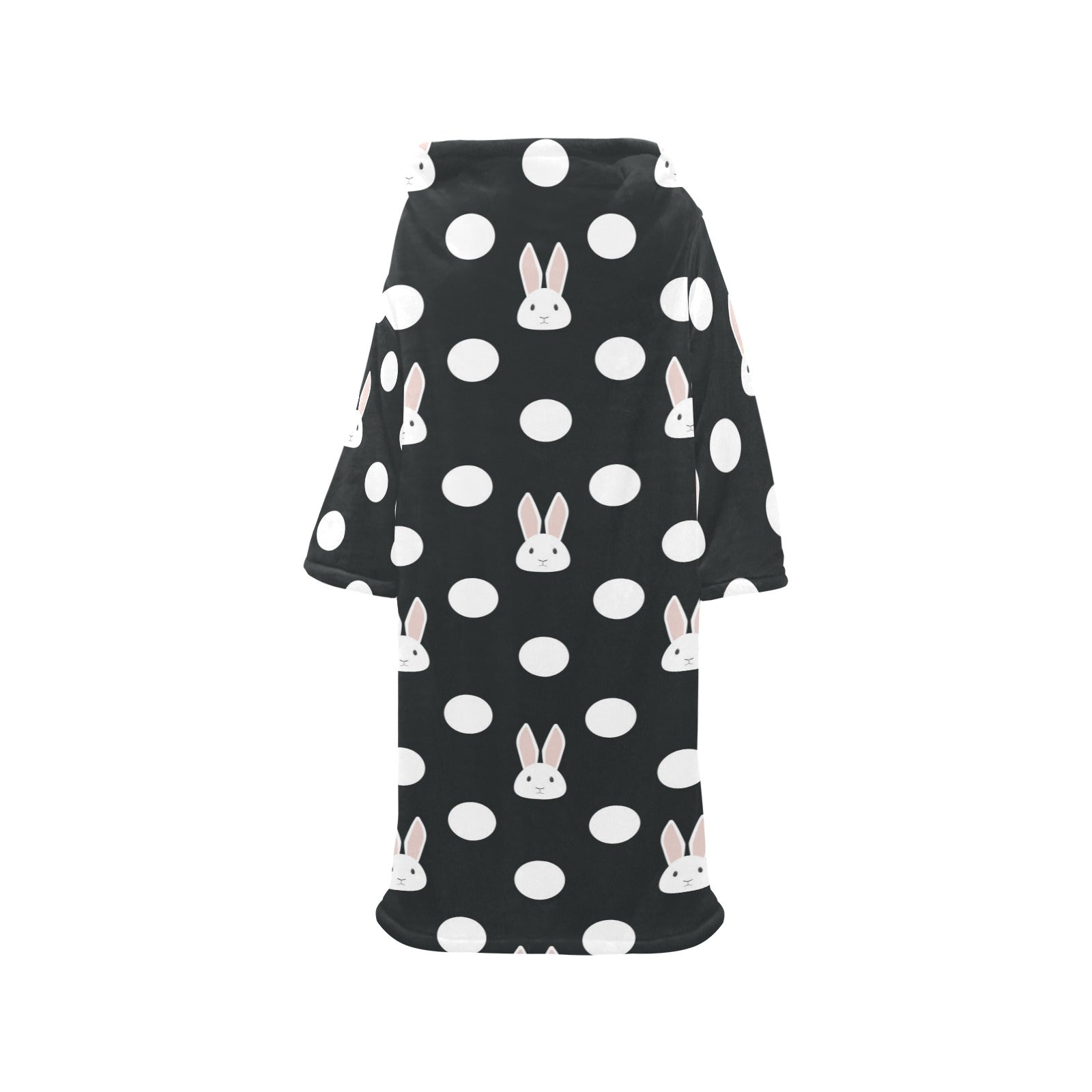 Cute white rabbit polka dots black background Blanket Robe with Sleeves