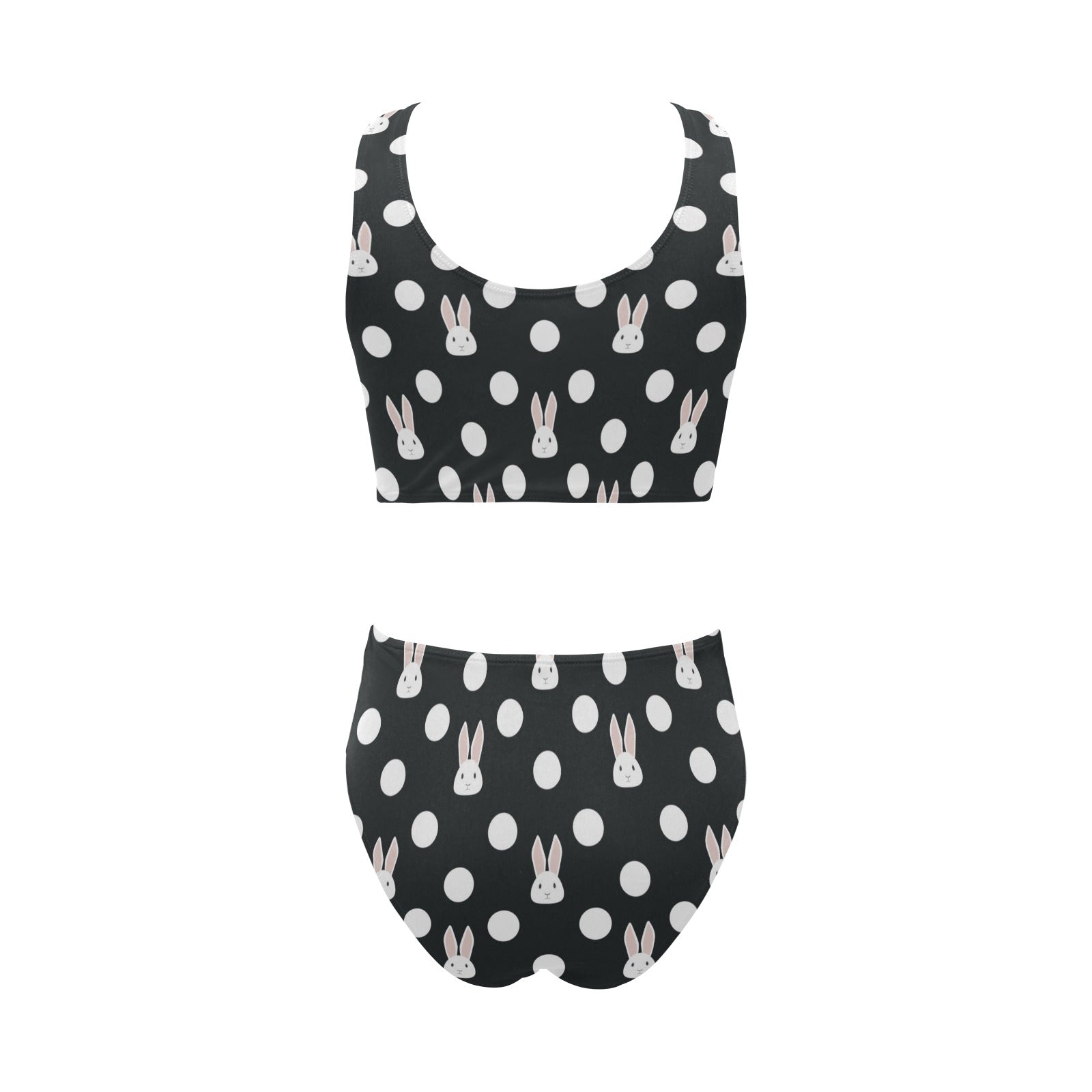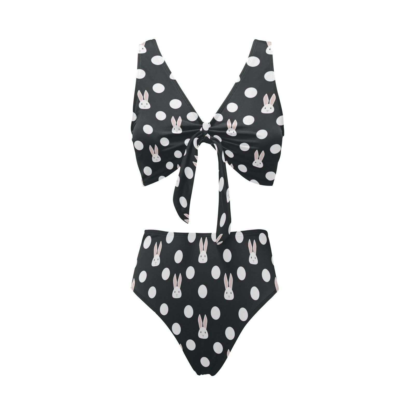 Cute white rabbit polka dots black background Chest Bowknot High Waisted Bikini Swimsuit