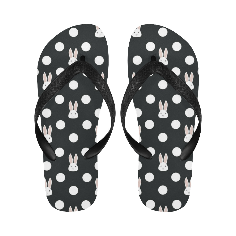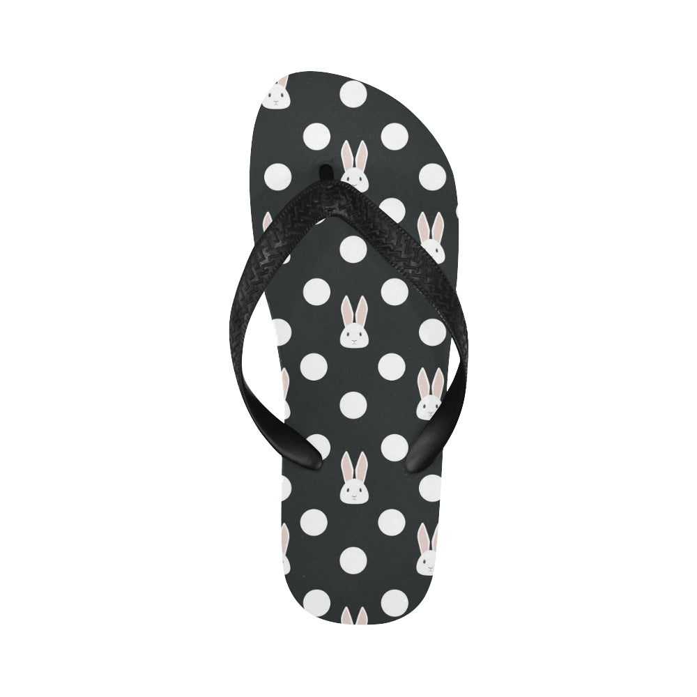 Cute white rabbit polka dots black background Unisex Flip Flops is a uniqued design and limited item. It made to order, hand printed, and sewn with love in our factory.