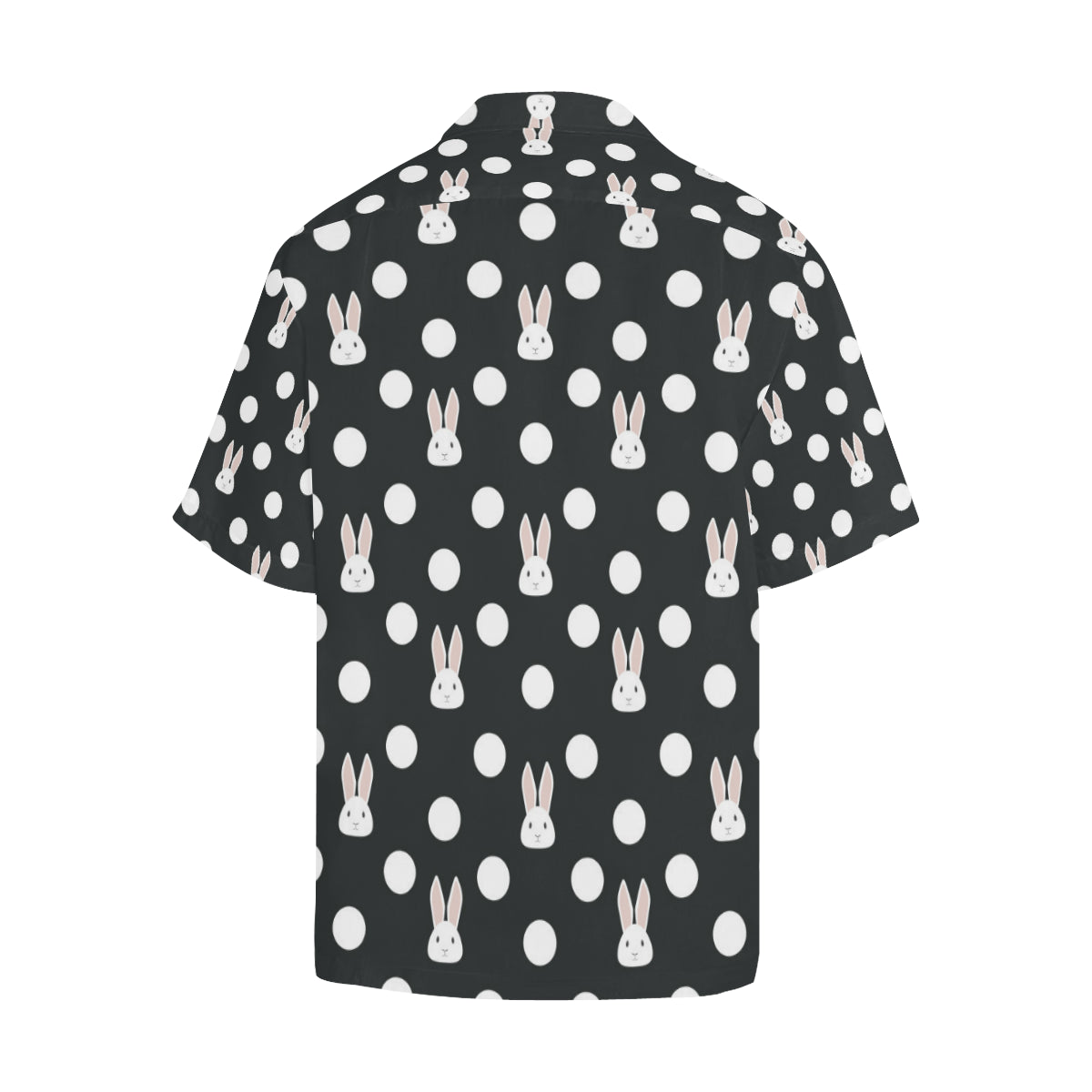 Cute white rabbit polka dots black background Men's All Over Print Hawaiian Shirt is a uniqued design and limited item. It made to order, hand printed, and sewn with love in our factory.