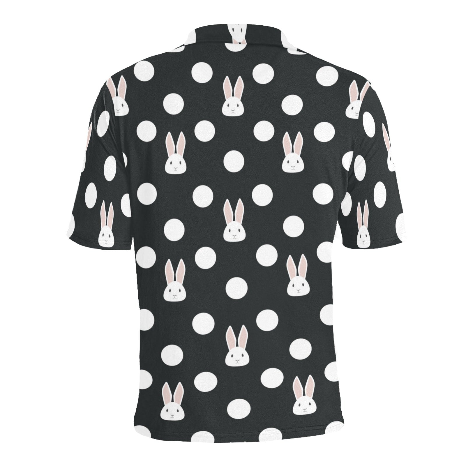 Cute white rabbit polka dots black background Men's All Over Print Polo Shirt