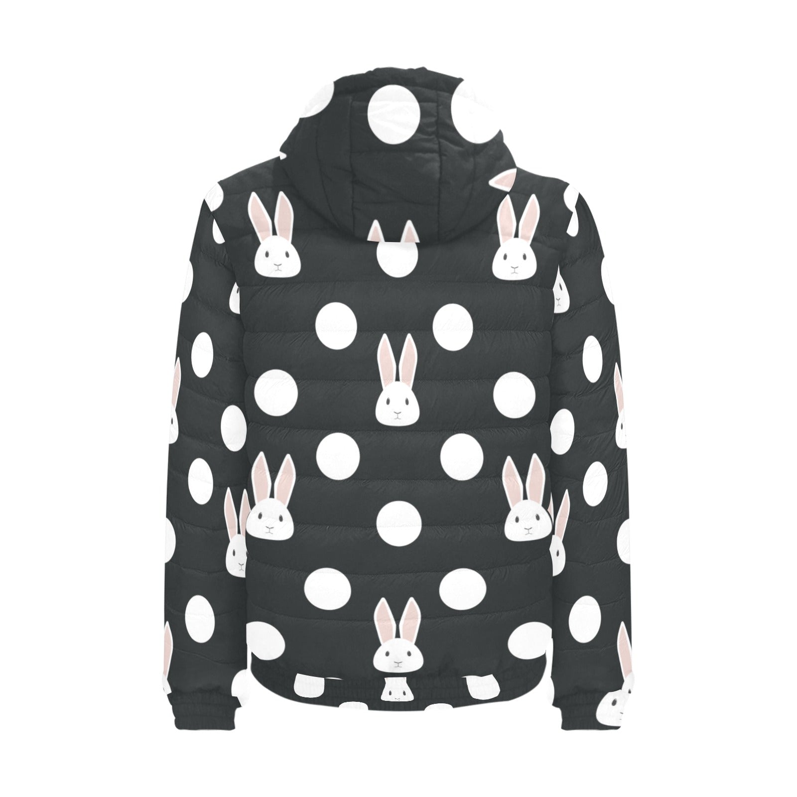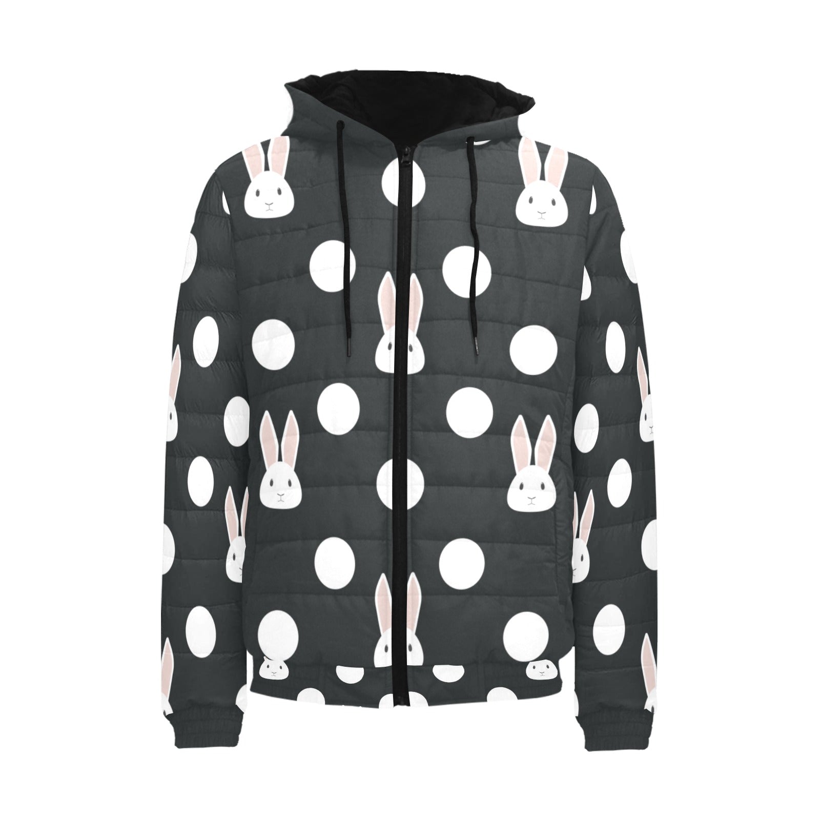 Cute white rabbit polka dots black background Men's Padded Hooded Jacket