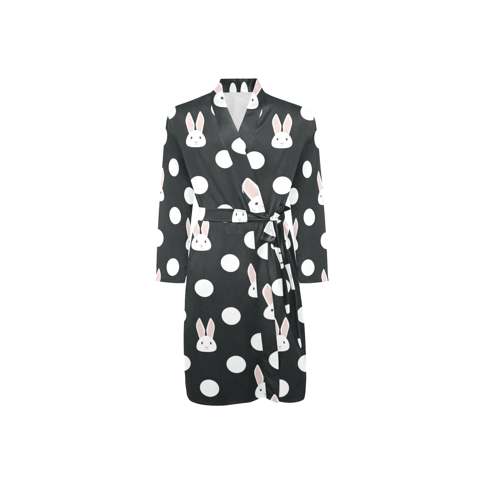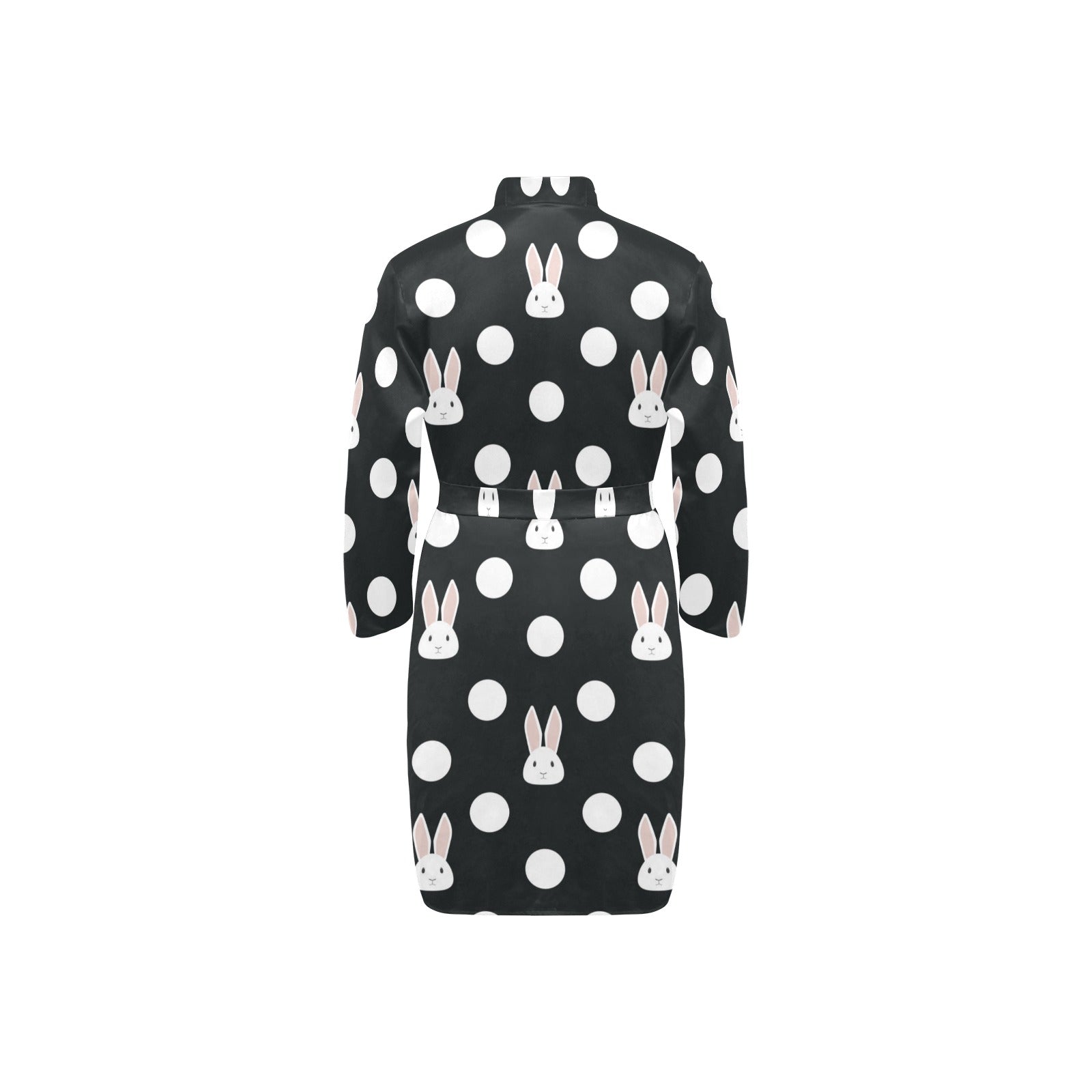 Cute white rabbit polka dots black background Men's Long Sleeve Belted Night Robe