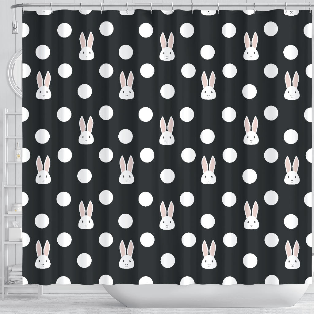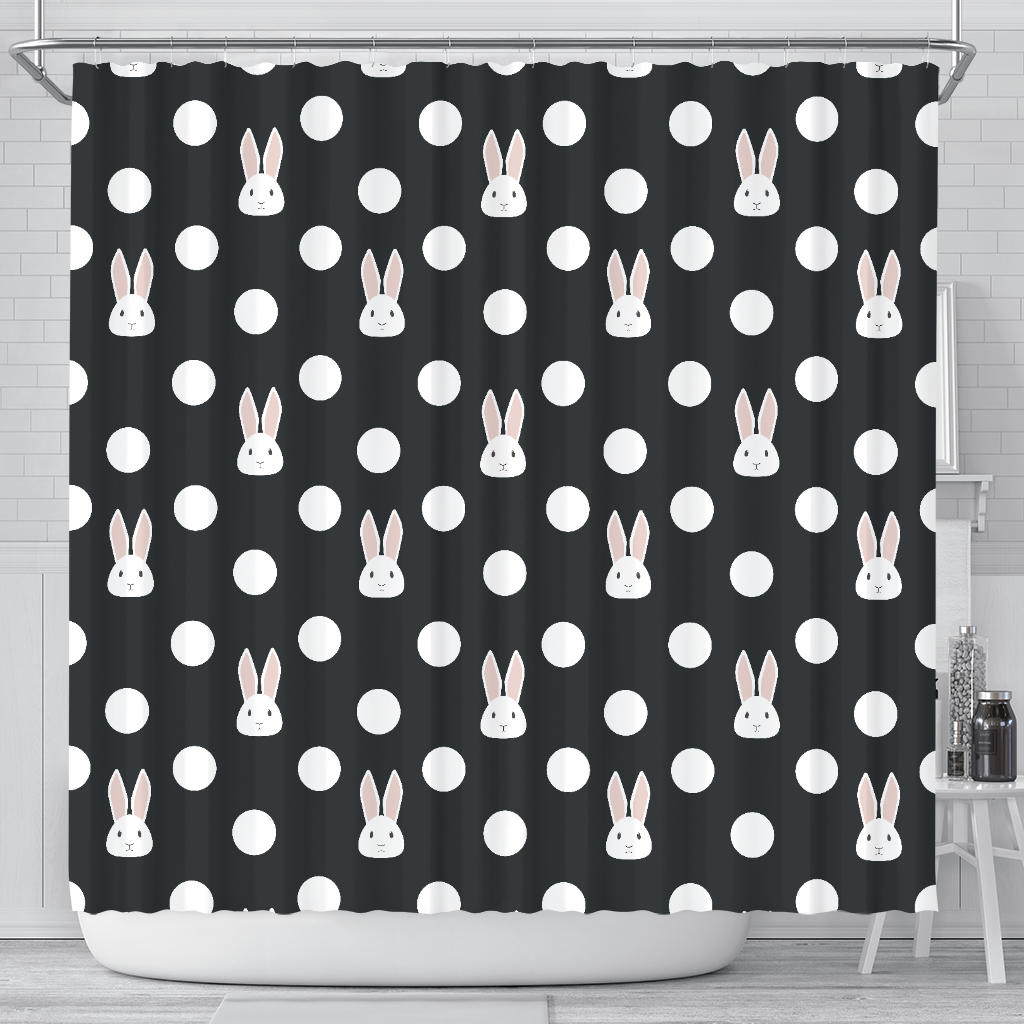 Cute white rabbit polka dots black background Shower Curtain is a uniqued design and limited item. It made to order, hand printed, and sewn with love in our factory.