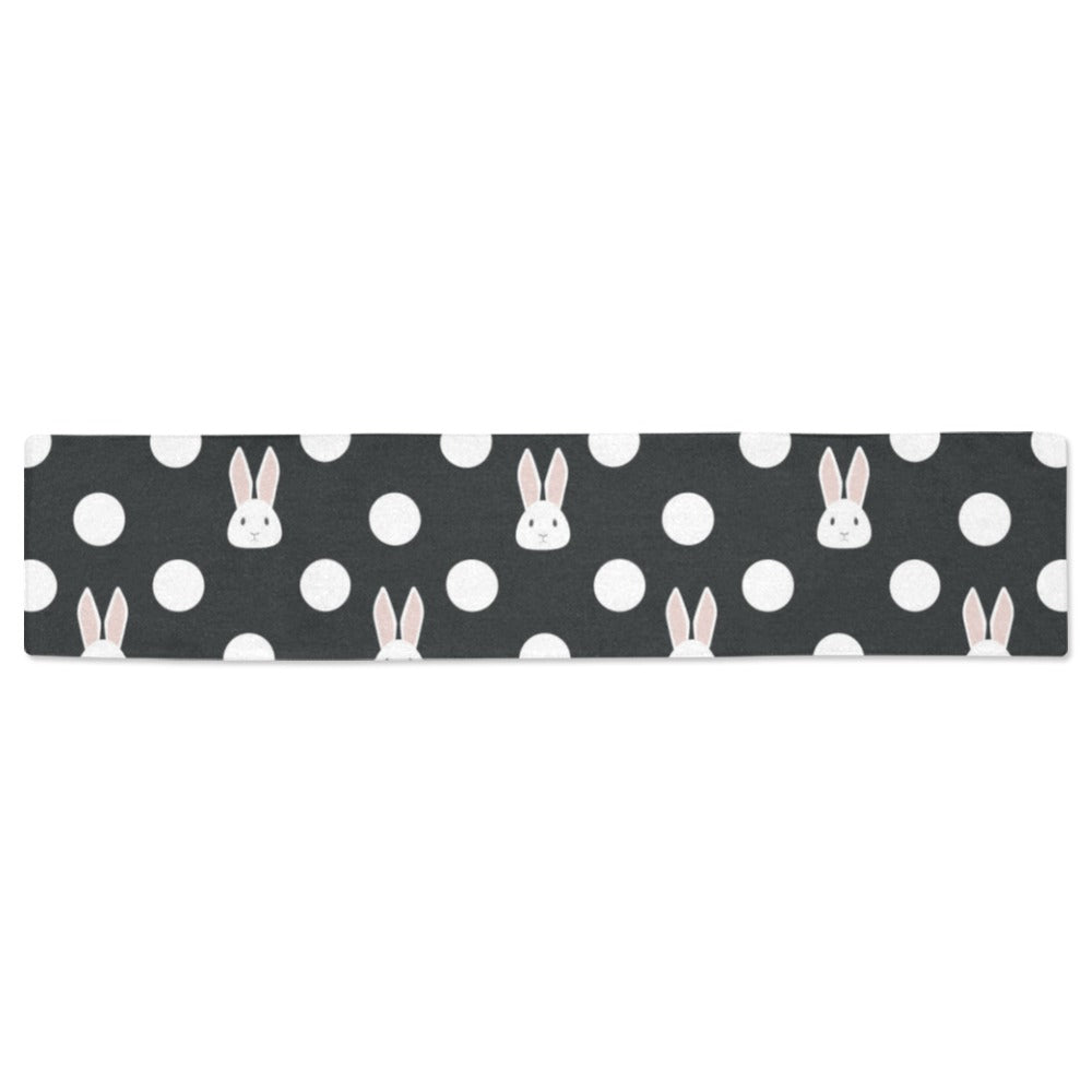 Cute white rabbit polka dots black background Table Runner