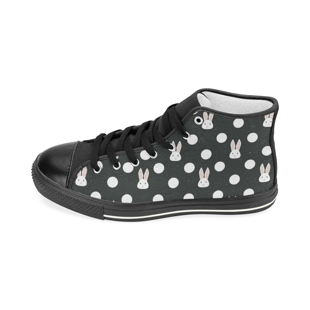 Cute white rabbit polka dots black background Women's High Top Canvas Shoes Black