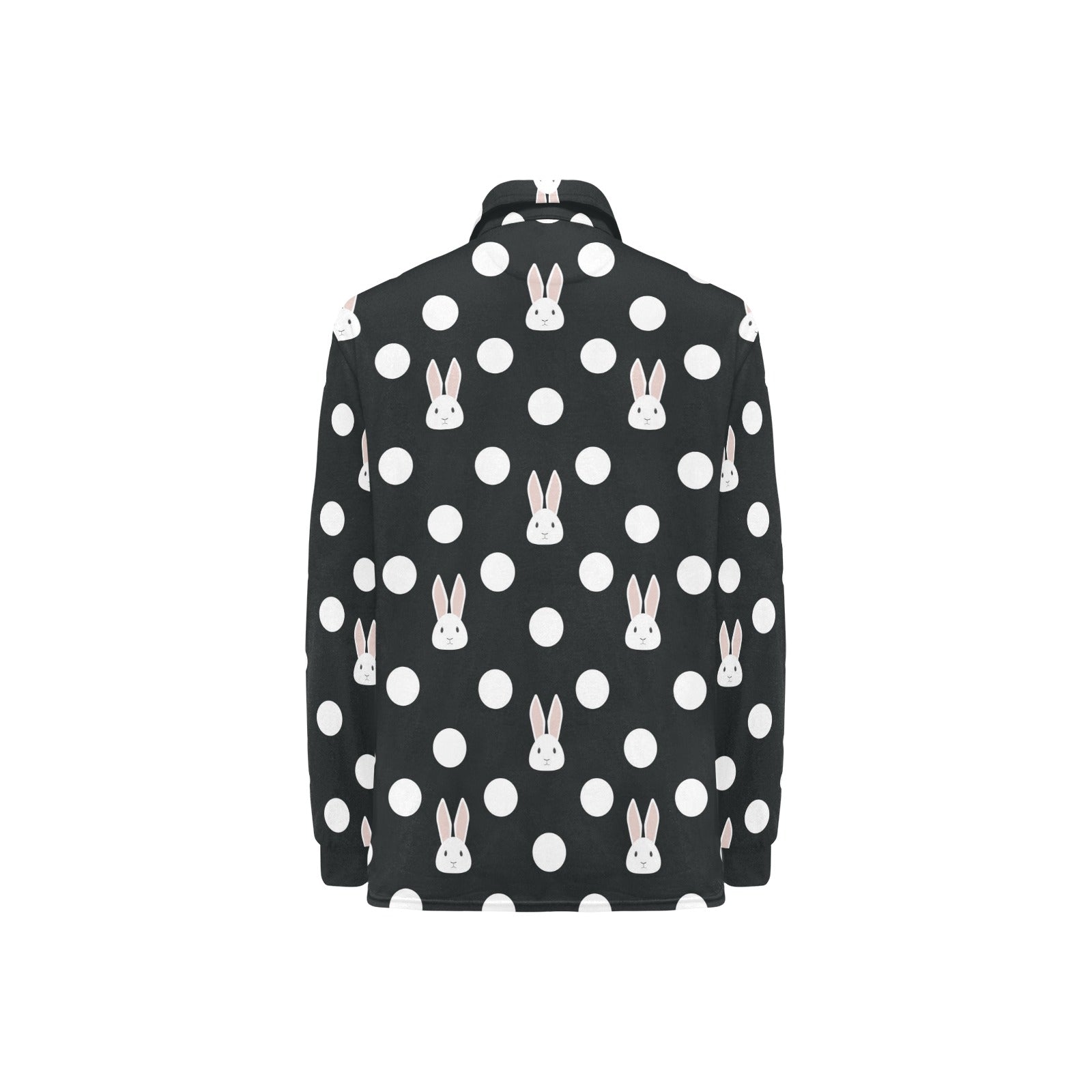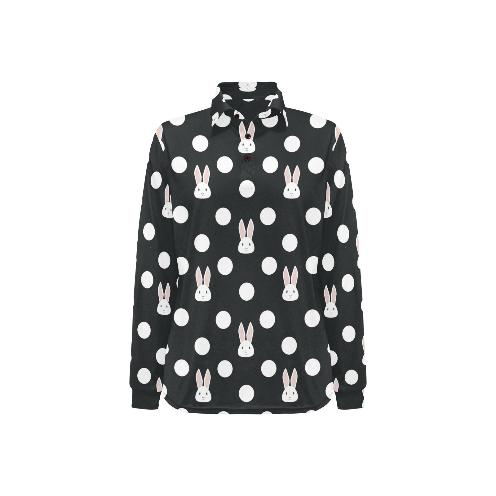 Cute white rabbit polka dots black background Women's Long Sleeve Polo Shirt
