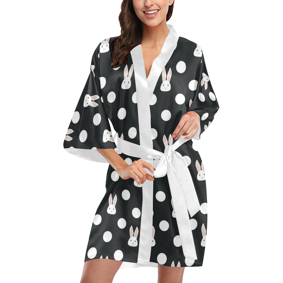 Cute white rabbit polka dots black background Women's Short Kimono Robe is a uniqued design and limited item. It made to order, hand printed, and sewn with love in our factory.