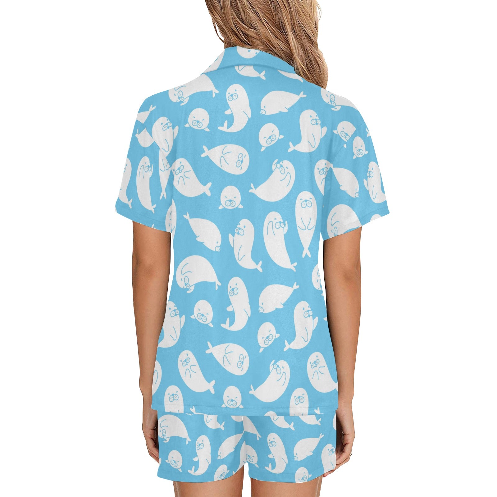 Cute white sea lion seals pattern Women's V-Neck Short Pajama Set