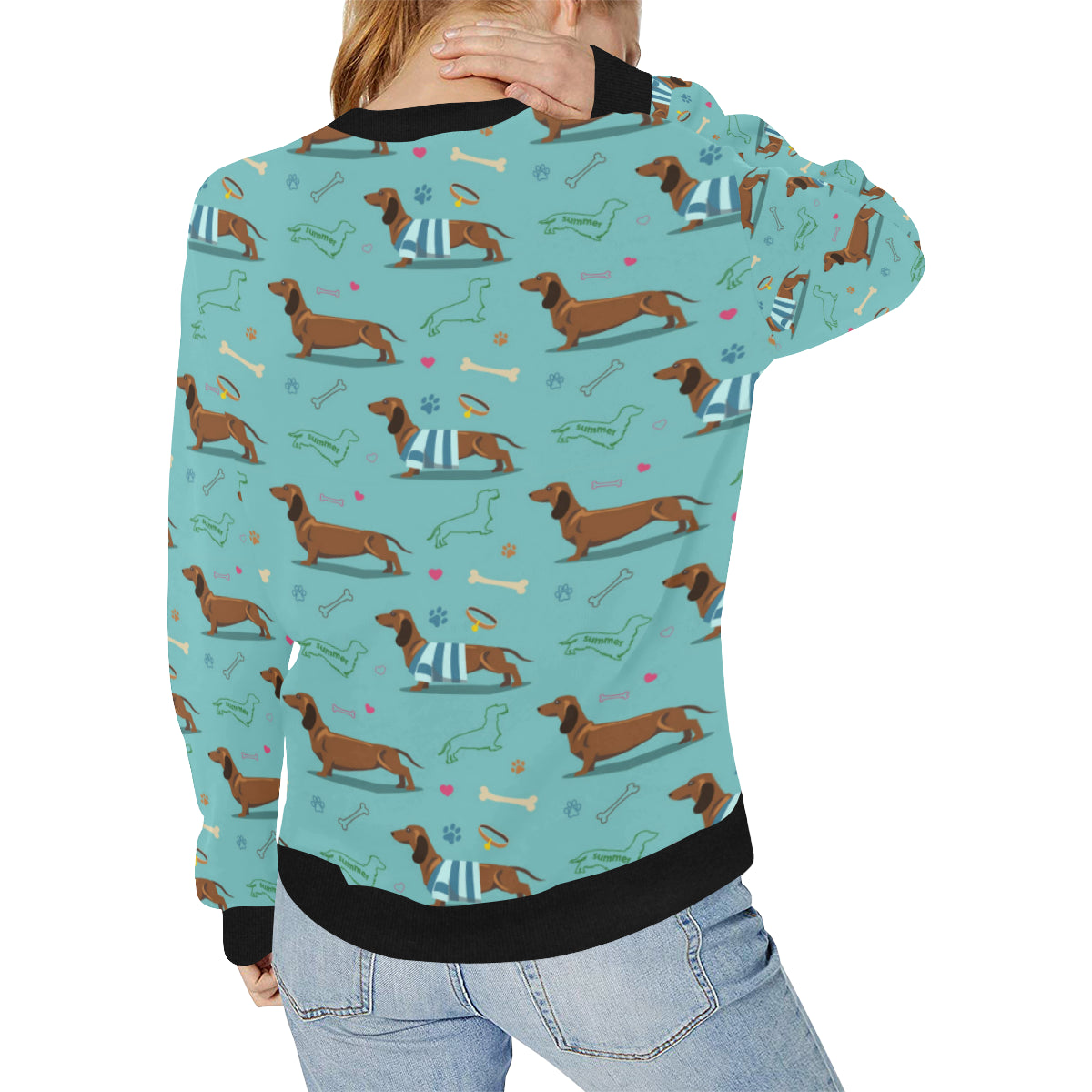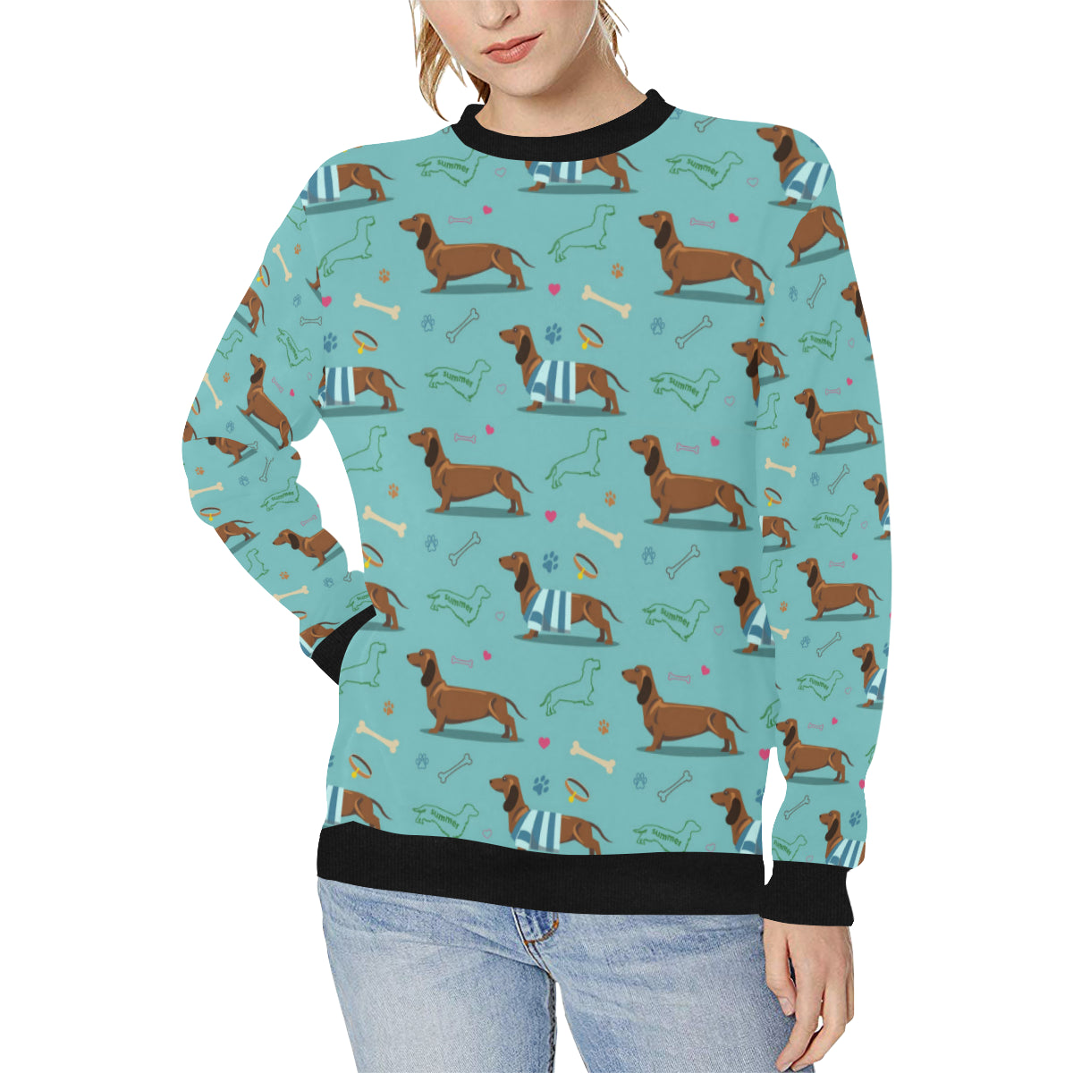 Dachshund decorative background Women's Crew Neck Sweatshirt is a uniqued design and limited item. It made to order, hand printed, and sewn with love in our factory.