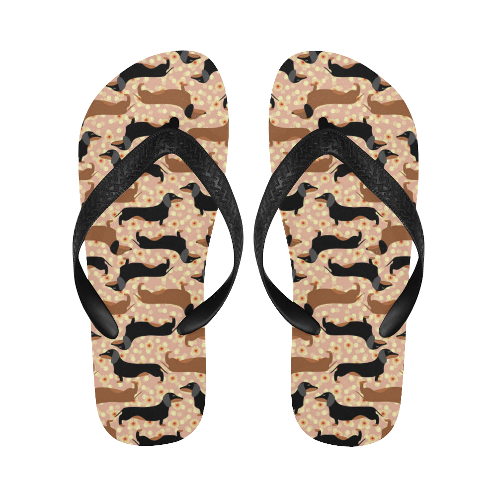 Dachshund floral background Unisex Flip Flops is a uniqued design and limited item. It made to order, hand printed, and sewn with love in our factory.