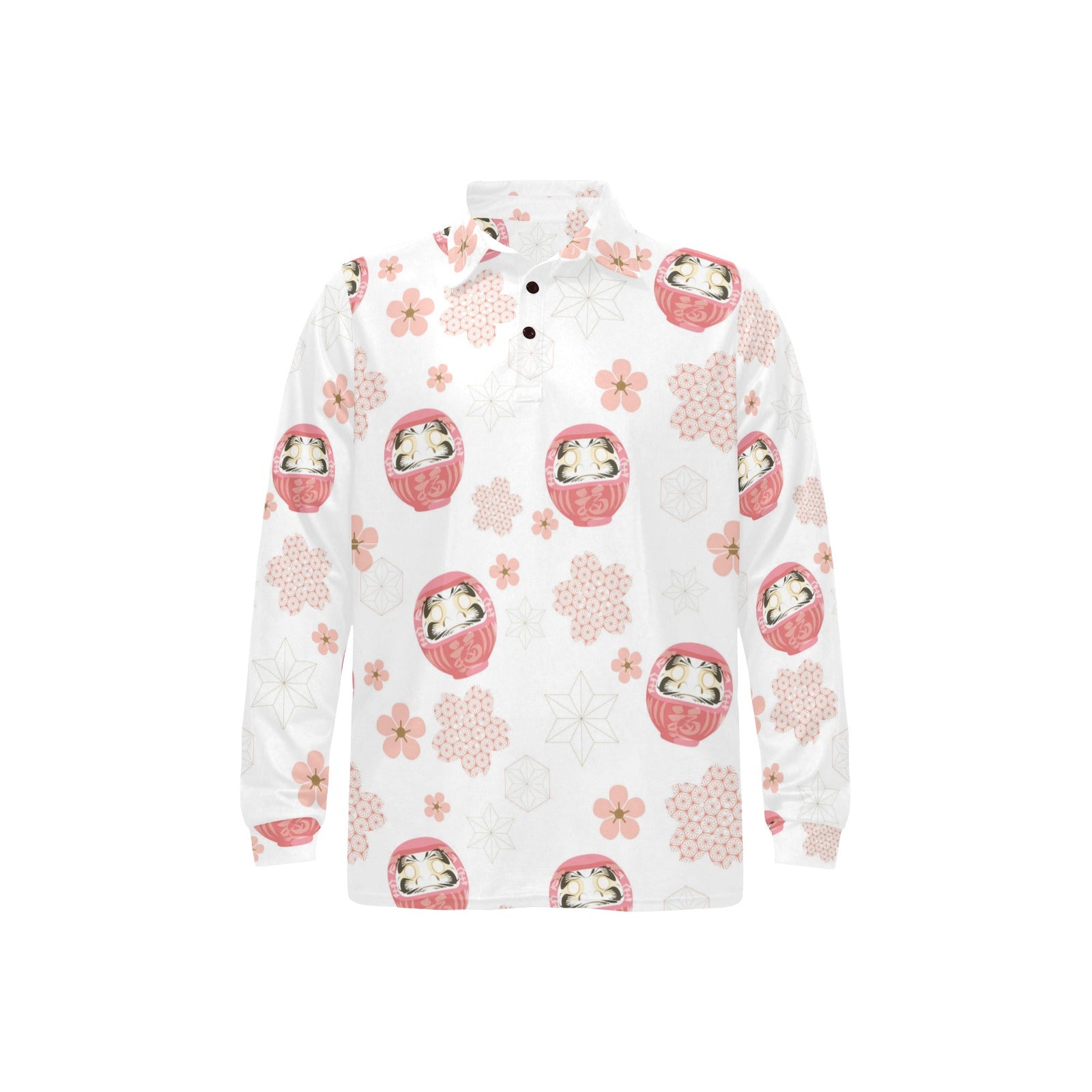Daruma japanese wooden doll cherry blossom flower Men's Long Sleeve Polo Shirt
