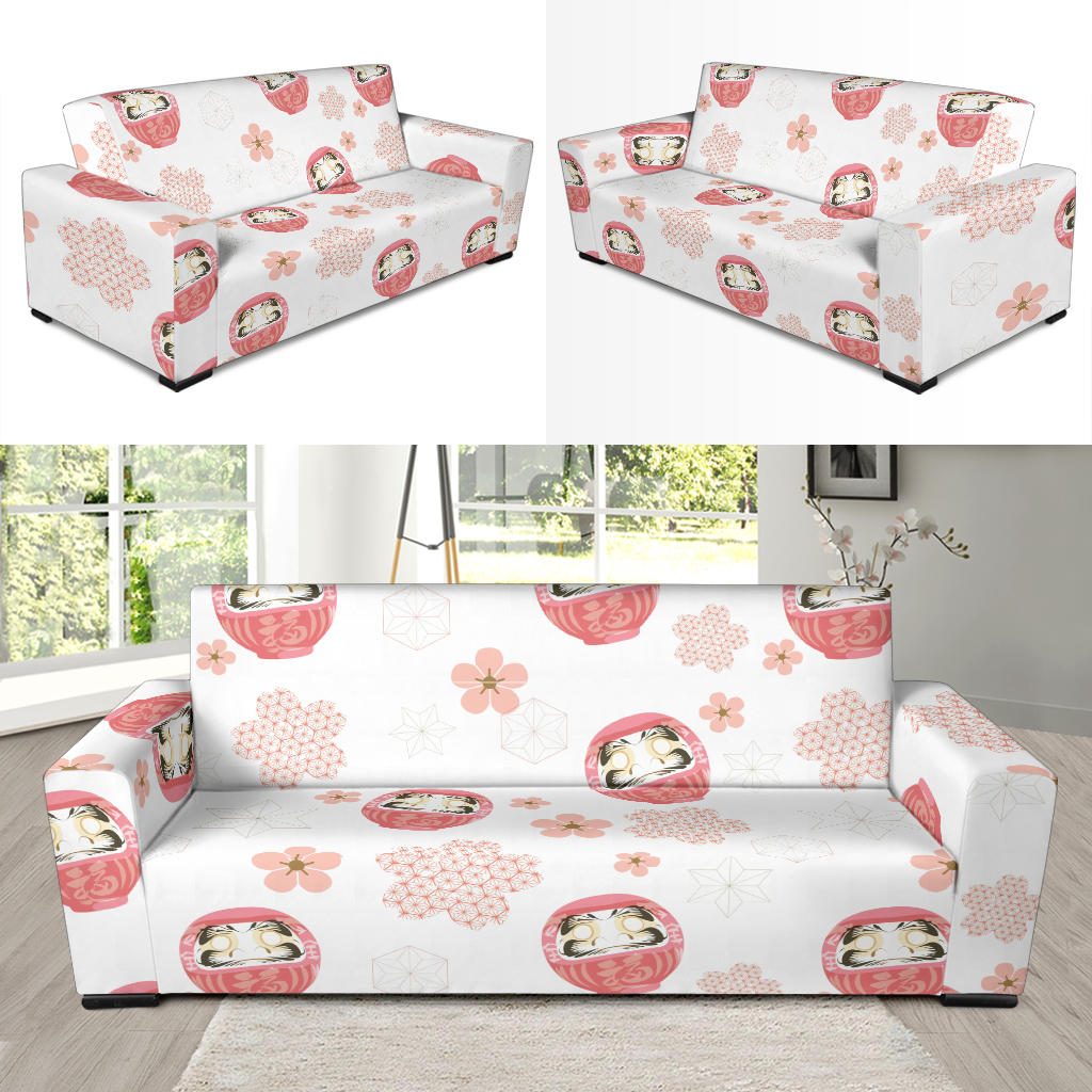 Daruma japanese wooden doll cherry blossom flower pattern Sofa Slipcover is a uniqued design and limited item. It made to order, hand printed, and sewn with love in our factory.