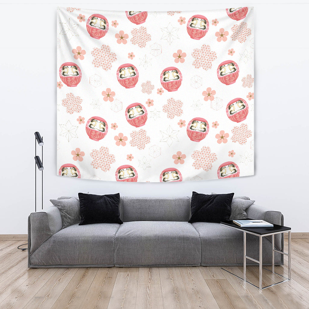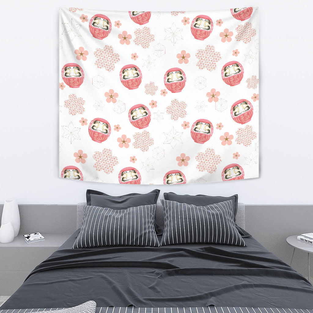 Daruma Japanese Wooden Doll Cherry Blossom Flower Pattern Wall Tapestry