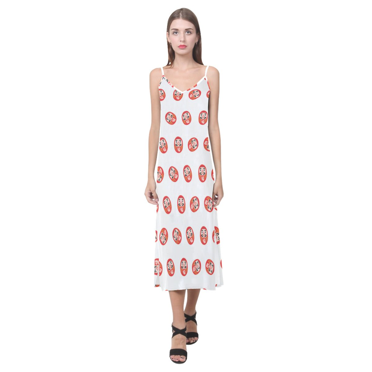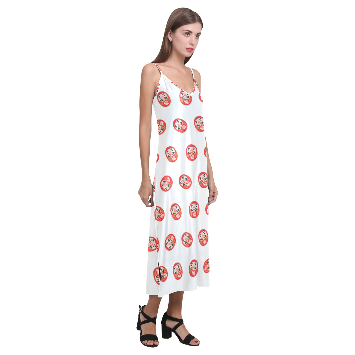 Daruma japanese wooden doll pattern V-Neck Open Fork Long Dress is a uniqued design and limited item. It made to order, hand printed, and sewn with love in our factory.