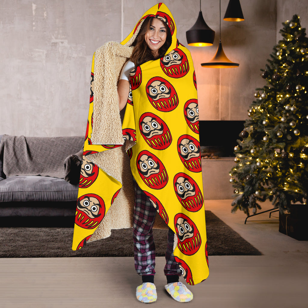 Daruma japanese wooden doll yellow background Hooded Blanket are custom-made-to-order and handcrafted to the highest quality standards.