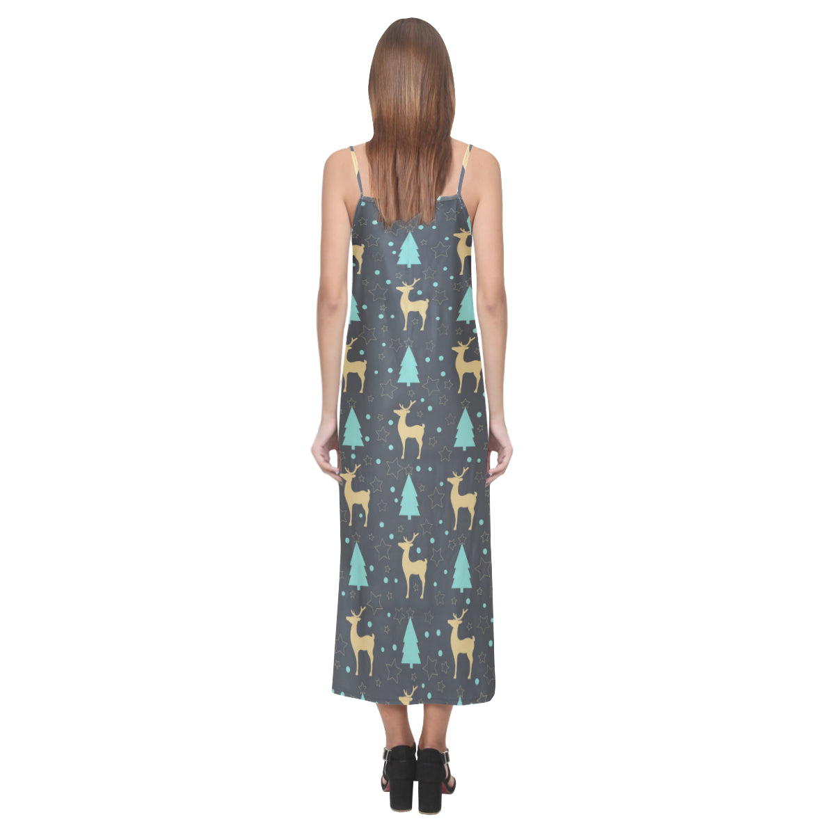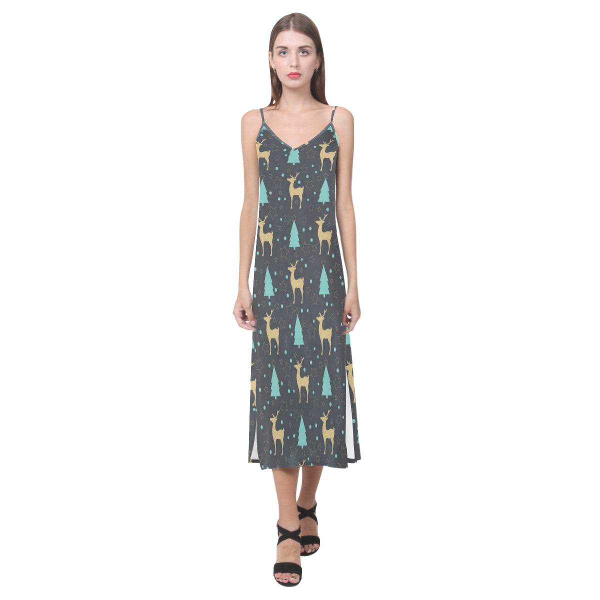 Deers star tree pattern V-Neck Open Fork Long Dress is a uniqued design and limited item. It made to order, hand printed, and sewn with love in our factory.