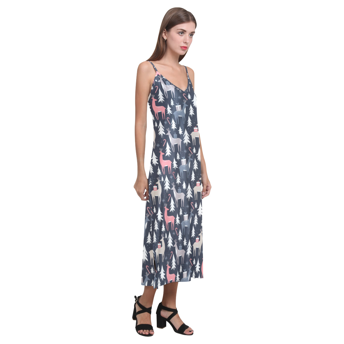 Deers Winter Christmas pattern V-Neck Open Fork Long Dress is a uniqued design and limited item. It made to order, hand printed, and sewn with love in our factory.