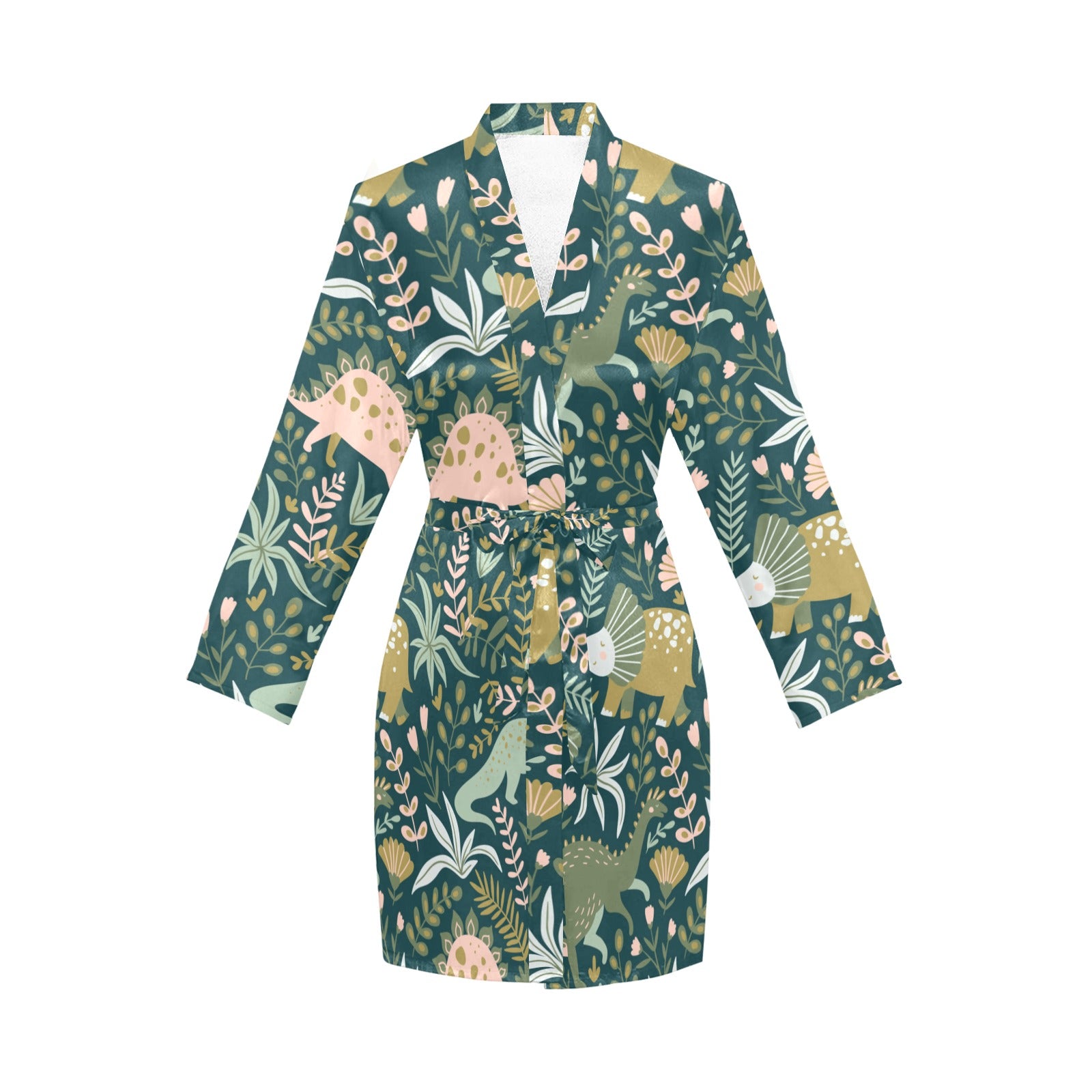 dinosaurs tropical leaves flower pattern Women's Long Sleeve Belted Night Robe