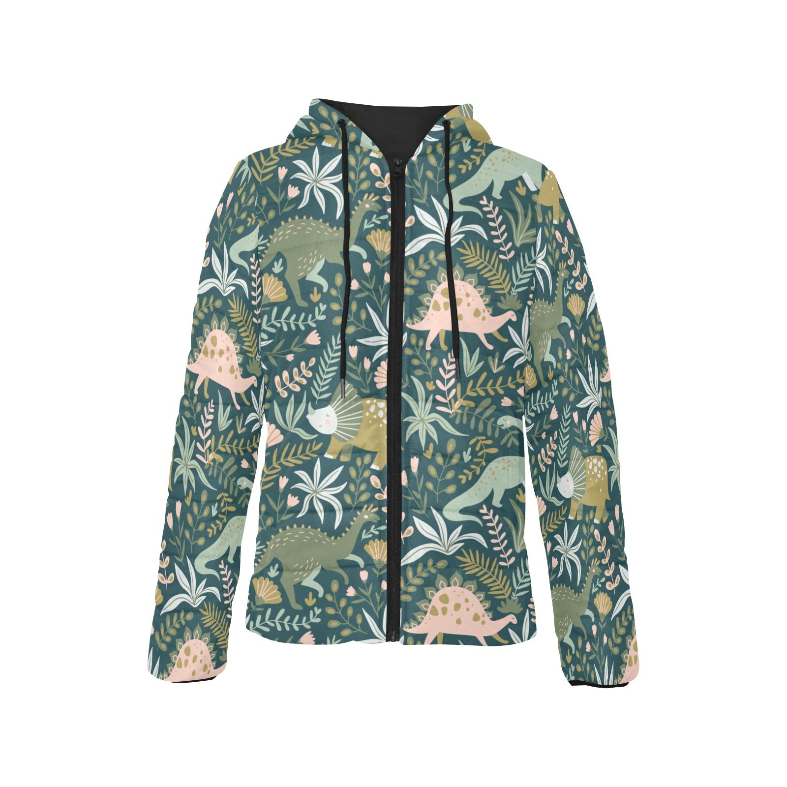 dinosaurs tropical leaves flower pattern Women's Padded Hooded Jacket