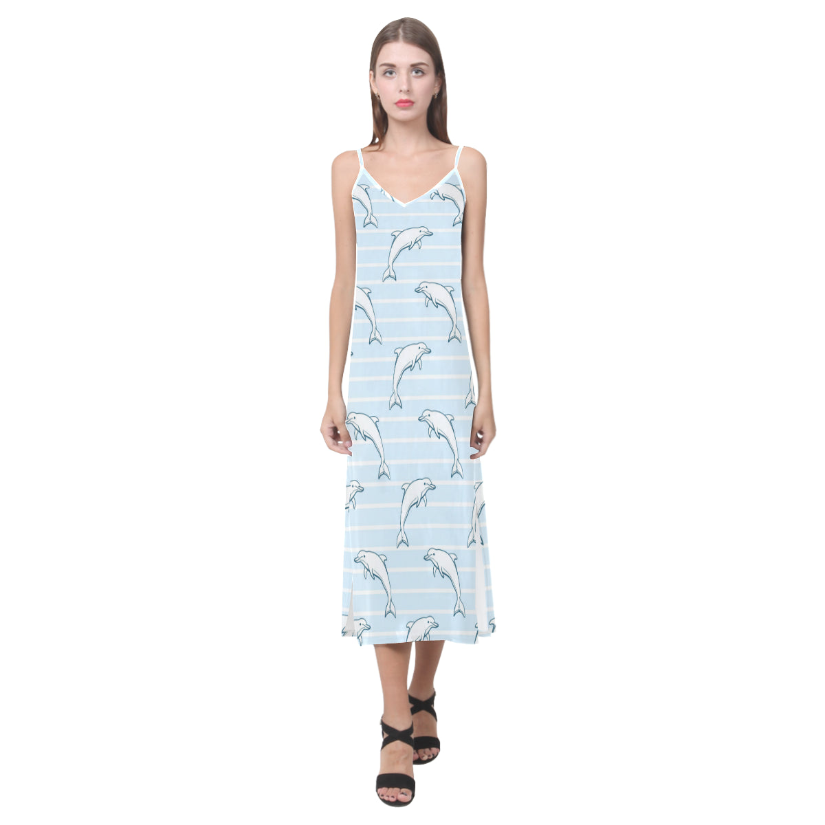 Dolphin blue striped background V-Neck Open Fork Long Dress is a uniqued design and limited item. It made to order, hand printed, and sewn with love in our factory.